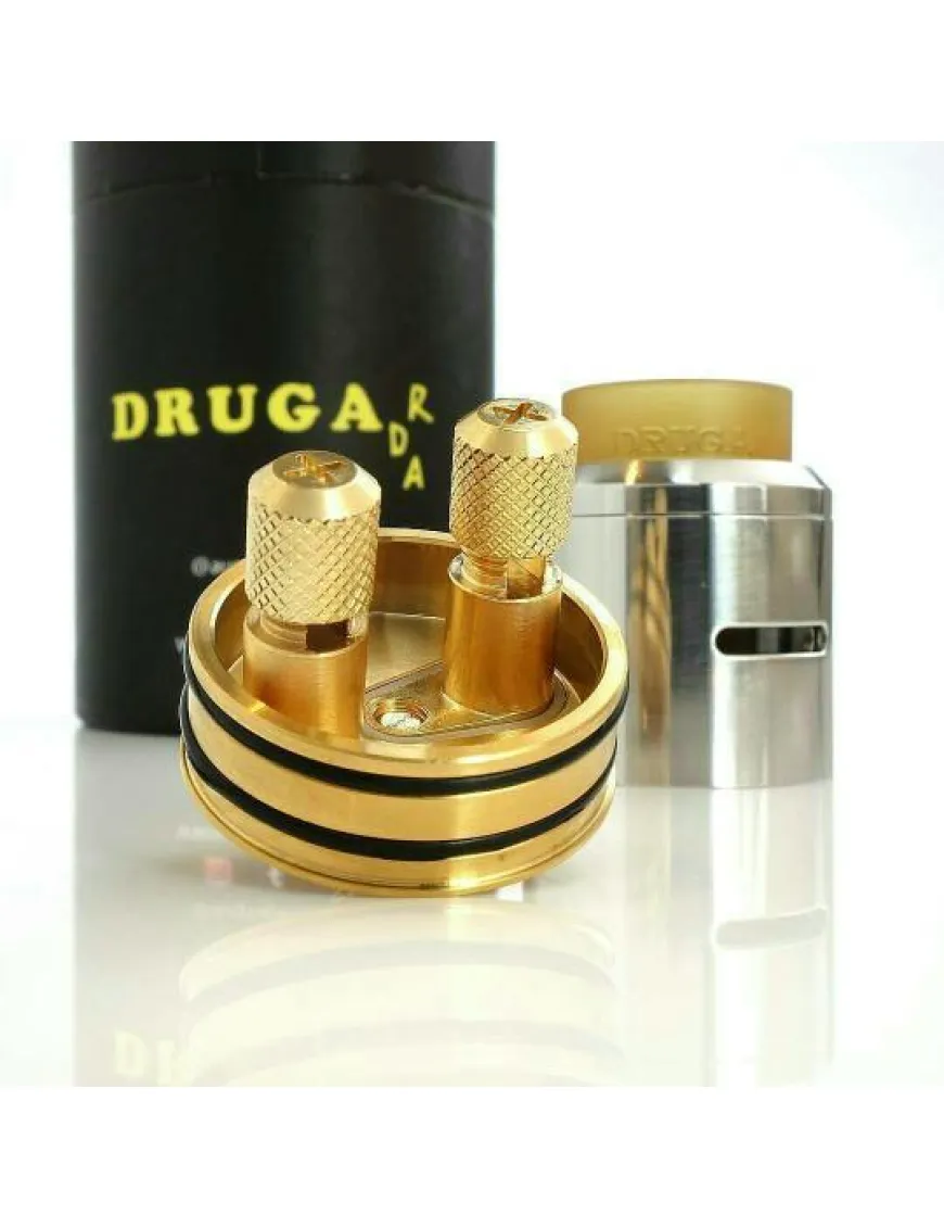 Дрипка Druga RDA має діаметр 22 мм, виготовлена із нержавіючої 304 сталі. Конектор 510 з 25-каратним позолоченим сквонк піном, який відмінно працює у цьому наборі. Також у комплекті є позолочений не сквонк пін.