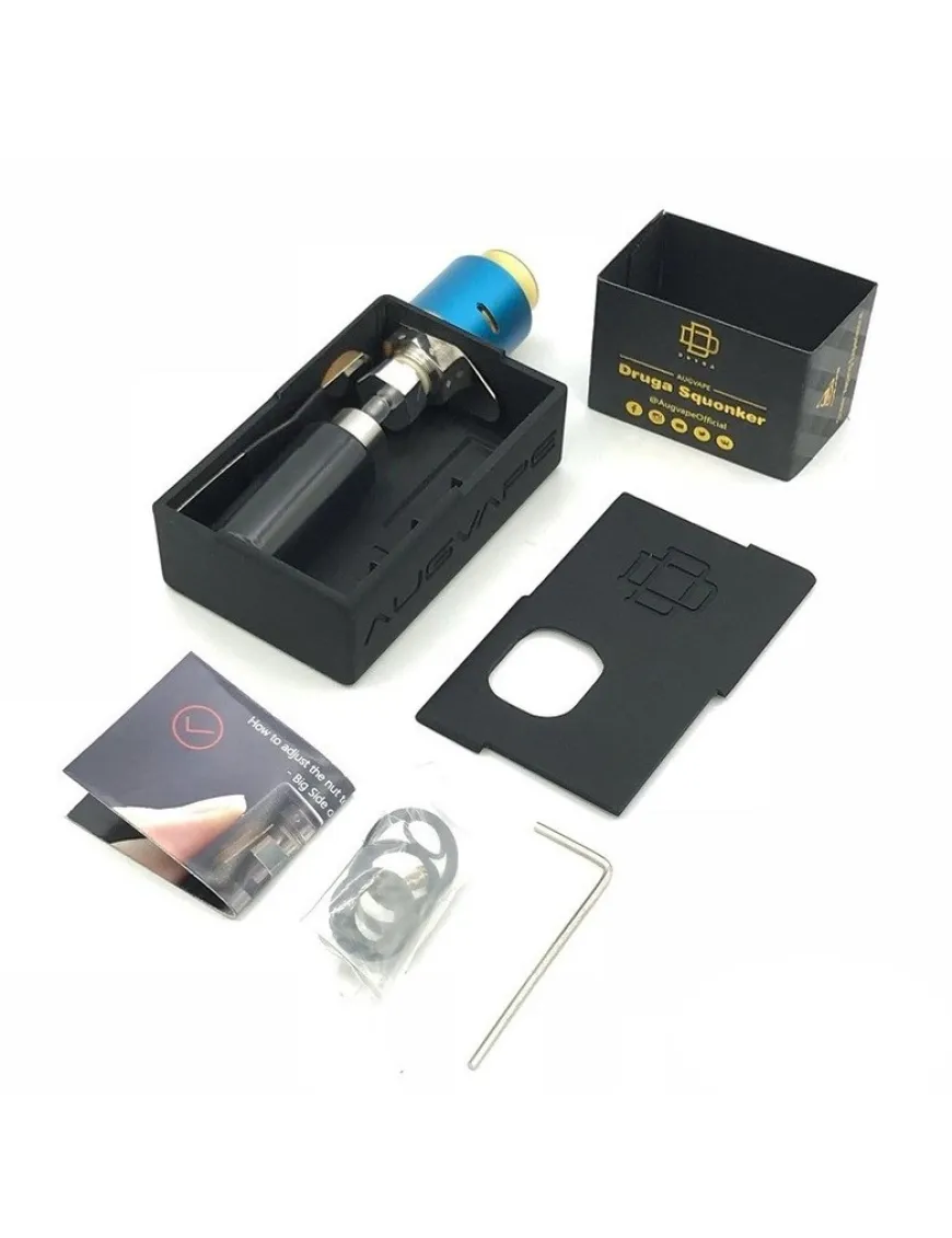 Набір AugVape Druga Squonk складається з механічного сквонк мода та дріпки Druga RDA на 22 мм. Мод виготовлений із софт-тач пластику. Угорі пристрою встановлений 510 конектор з пружним піном. До піну приєднаний силіконовий флакон на 5 мл.
