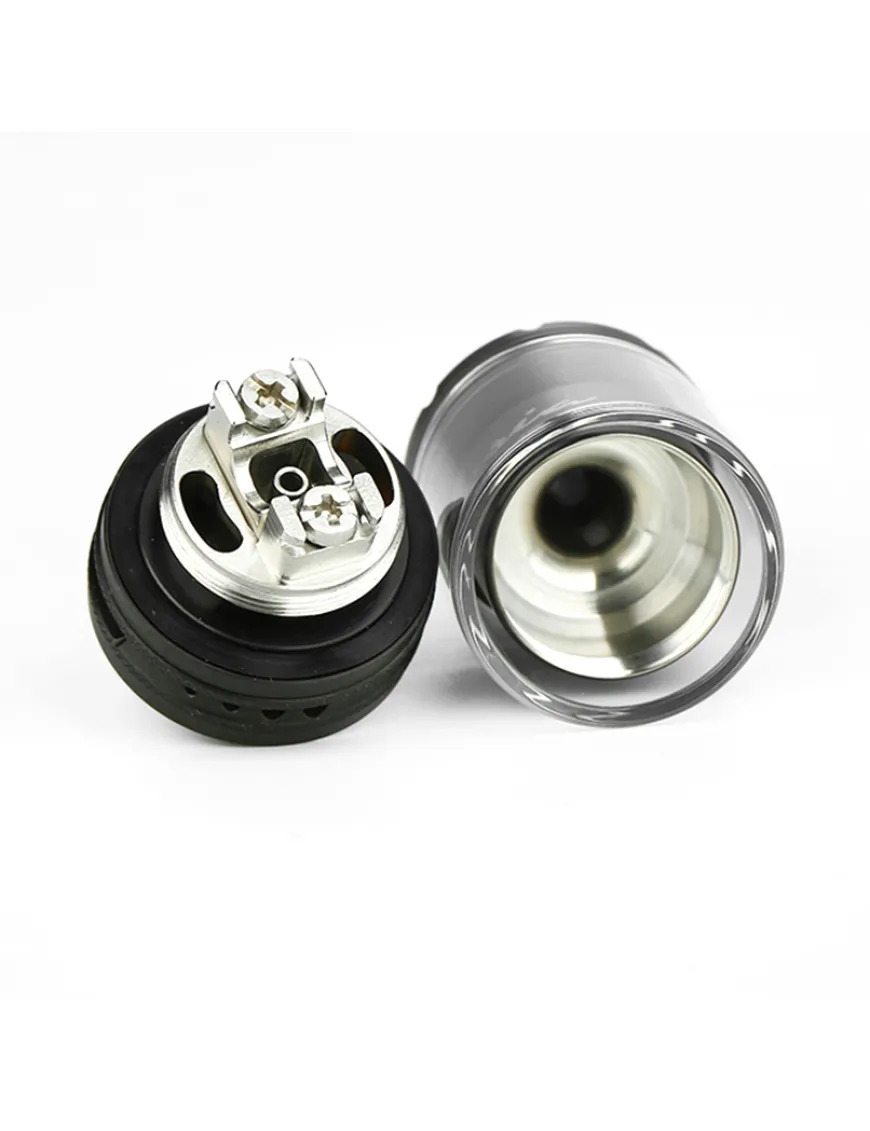 - Система обдування тут традиційна для більшості сучасних бакомайзерів - так, повітря для обдування спіралей забиратиметься в нижній частині бака. На базі передбачено кільце для того, щоб можна було відрегулювати кількість повітря, що надходить за своєю перевагою. Повітря проходить через базу та надходить до встановленої спіралі через отвір під спіралями. Далі починається цікаве: кільце регулювання обдування може відкривати два основні положення – для тугої затяжки та для вільної затяжки. Ці два канали подачі повітря працюють незалежно один від одного і в поєднанні з подвійною системою подачі повітря під спіраль забезпечують універсальність пристрою, дозволяючи налаштувати його як на вільну затяжку за принципом кальянної, так і тугу сигаретного типу. Широка щілина обдування максимально здатна видати площу отвору 2 x 9 мм + 1.6 мм, отвори для тугої затяжки мають діаметри 0,8 мм, 1 мм, 1,2 мм і 1,6 мм;
