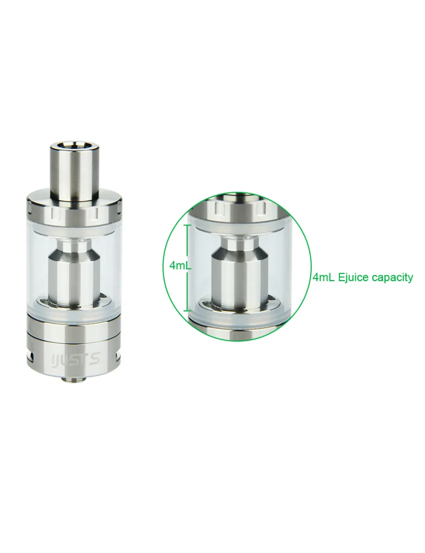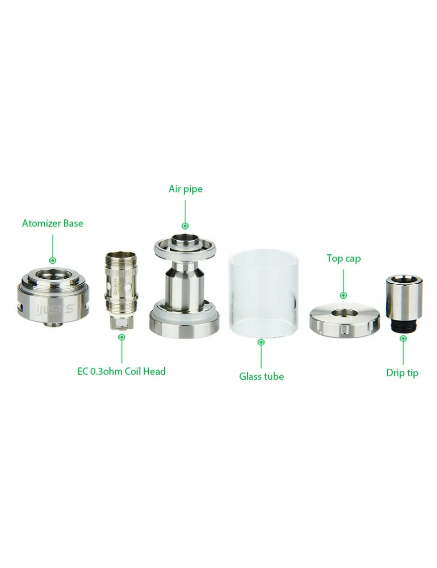 Кліромайзер iJust S виготовлений зі скла стійкого до постійного контакту з рідинами для заправки електронних сигарет і за рахунок невеликого збільшення габаритів пристрою в цілому, тепер вміщує до 4 мл рідини. Заправка провадиться через верх.