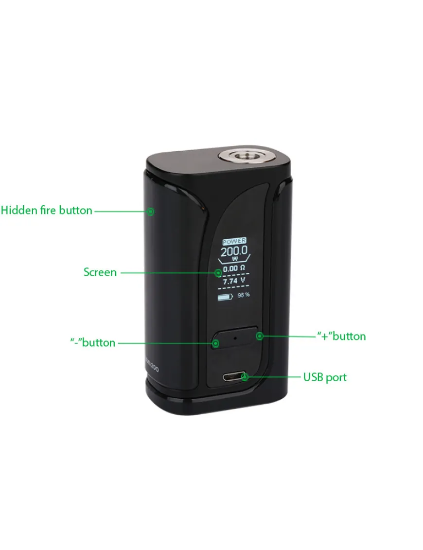 - Wattage, Temperature Ni, Ti, SS, M1, M2, M3 – основні режими роботи пристрою. Вариватт та чотири варіанти термоконтролю, останні з яких (M1-M3) дає можливість самостійного підстроювання електроніки під непередбачені із заводу матеріали;