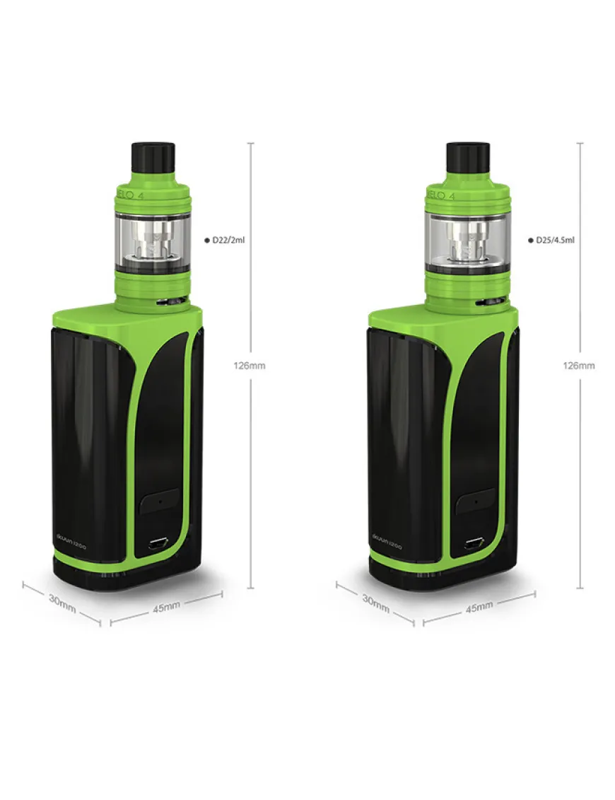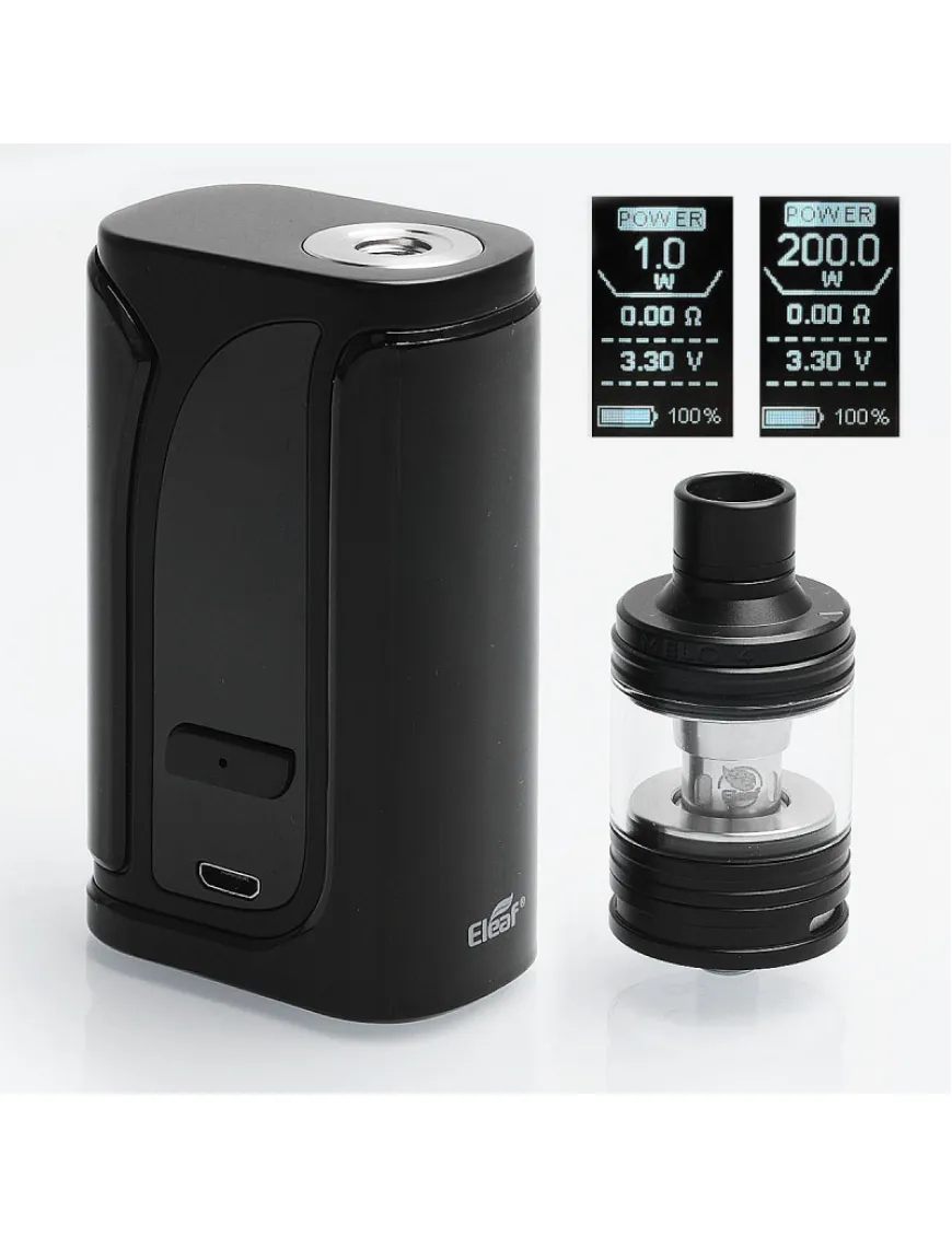 Цей набір складається з 200-ватного боксу мода чорного кольору та кліромайзера MELO 4 ємністю 4.5 мл з верхньою заправкою. Можливе встановлення будь-якого іншого випарника діаметром до 25мм. Живлення забезпечується вбудованим акумулятором ємністю 4600 мА-год, є підтримка Passthrough, що забезпечує можливість ширяння одночасно із зарядкою акумулятора. Обдув регулюється поворотним кільцем. Підтримуються всі сучасні режими – байпас, варіват та термоконтроль з налаштуванням температурного коефіцієнта TCR. Невеликий екран забезпечує відображення різної інформації – рівня заряду, потужності тощо.
