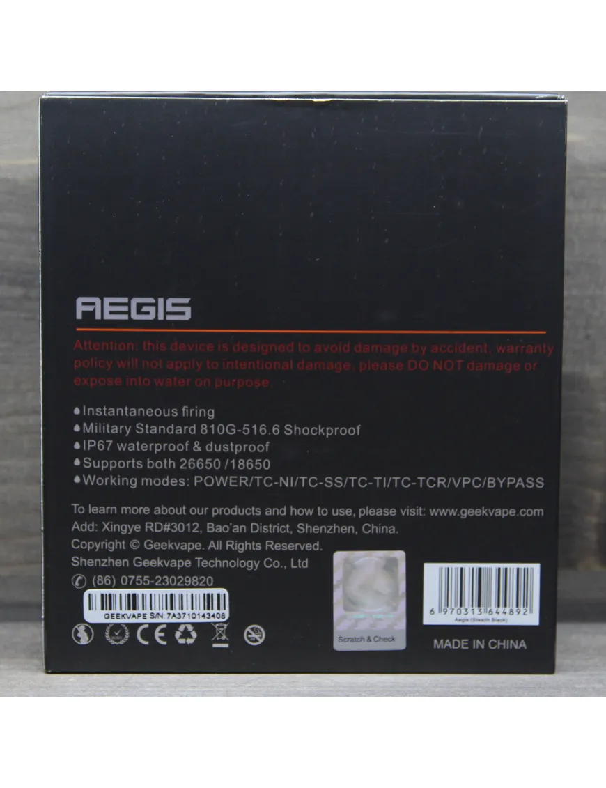 GeekVape Aegis 100W – це мікс алюмінію, цинкового сплаву та силікону, які стоїчно тримають удар, не боячись подряпин та потертостей. Кожзамові вставки з великими швами "теплі", немов ламповий звук. Корпус виробу, виконаний за технологією LSR (лиття під тиском), що робить девайс ударостійким. Відповідає US Army стандарту MIL STD 810G-516.6. Супер-опірність механічним впливам робить Geek Vape Aegis практично вразливим і здатним вижити в найлютіших колотнечах. Навіть якщо Ви впустили бокс зі скелі або гарячий скакун ударив його копитом - безсмертний гаджет залишиться неушкодженим.