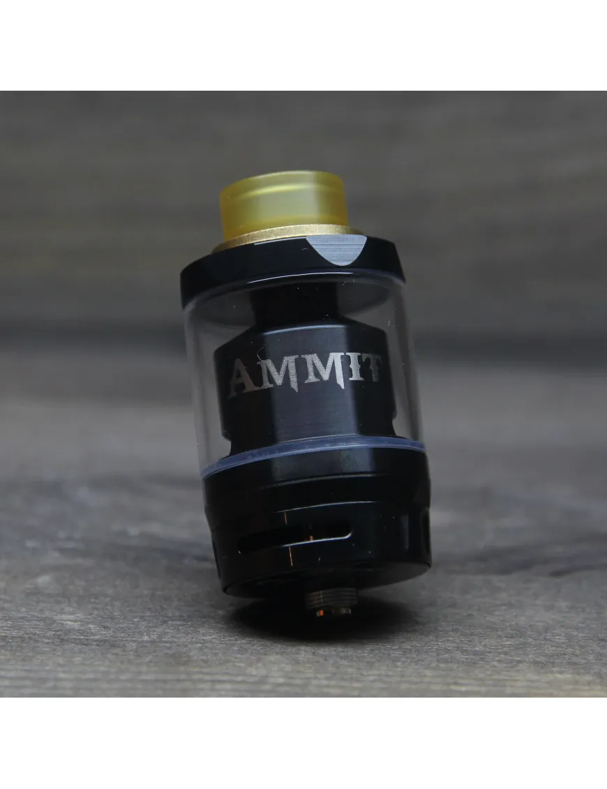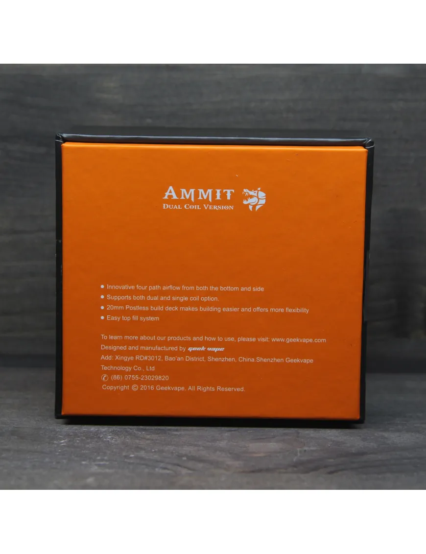Ammit dual coil rta - оновлений атомайзер, що обслуговується від компанії Geekvape Має незвичну для Geek Vape форму барила, ширина бака 27 мм, при посадковому місці 25 мм. Завдяки своєму розміру чудово виглядає на великих модах, навіть на чотири акумулятори. Виконаний з нержавіючої сталі та загартованого скла. Дрип-тип встановлюється у стильне позолочене кільце. Бак має верхню заправку рідини та нижнє регульоване обдування. Простий в експлуатації та догляду за рахунок повністю розбірної конструкції.