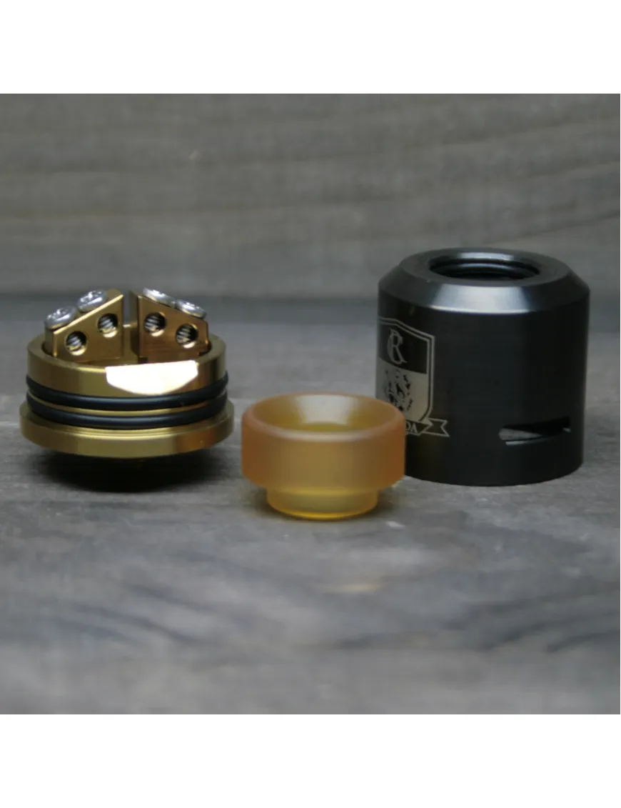 Висота із встановленим дрип-типом становить 32,5 мм. Посадка 25 мм у діаметрі. Трикутна база та 510 сквонк-пін позолочені.
