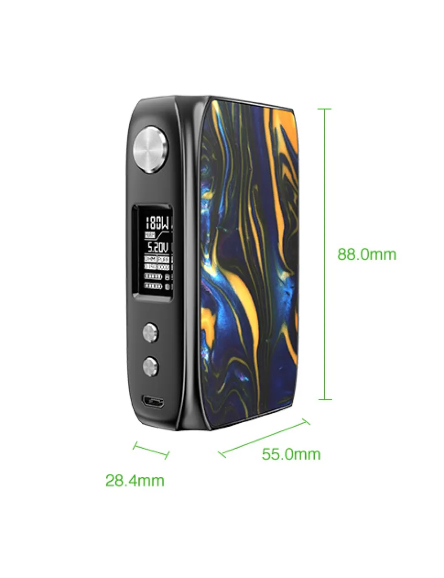 Конектор розташувався рівно по центру корпусу, через що є можливість розмістити на борту атомайзери діаметром 28 мм без бортиків, а для захисту від подряпин, передбачений сталевий майданчик.