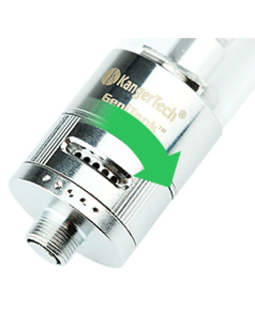 Стильний KangerTech GeniTank виконаний із хромованої міді та міцного скла. Завдяки повністю розбірній конструкції будь-яку деталь можна замінити. Застосування передової технології контролю подачі повітря не вимагатиме від Вас особливих труднощів: досить просто повернути нижнє кільце, відкривши або закривши відповідну кількість отворів повітря, необхідних для комфортної для Вас тяги.