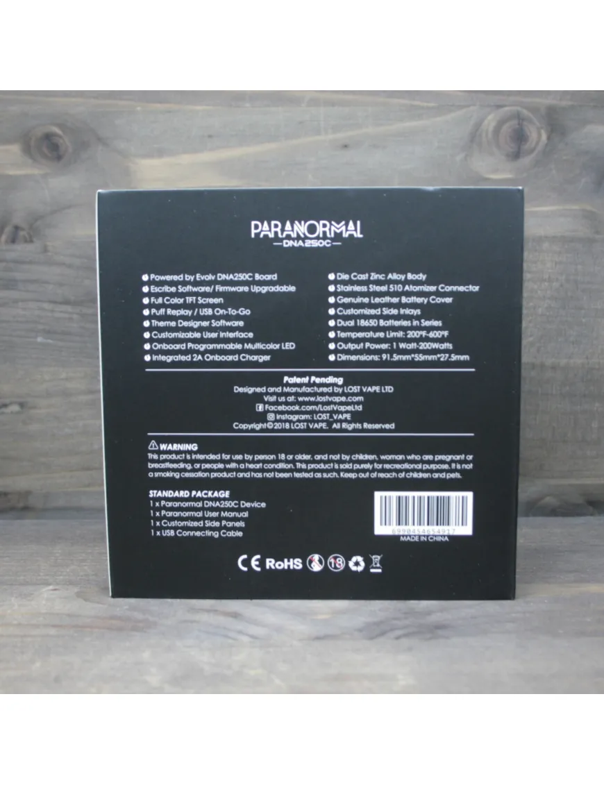 Lost Vape використовував чіпи DNA у низці своїх модів. Розробниками передбачено використовувати DNA 250C як повербанк за допомогою OTG USB адаптера (входить до комплекту). Діапазон вихідної потужності плати від 1 до 200 Вт. Кольоровий дисплей розміром 0.96”, відображає максимум необхідної інформації. У режимі TC Діапазон робочого опору від 0,08 до 1 Ом. На канталі Діапазон робітничого опору від 0.1 Ом до 2 Ом. Особливість Paranormal є функція REPLAY, вона дозволяє вейперу налаштувати ідеальний режим роботи і зберегти його для повторного використання.