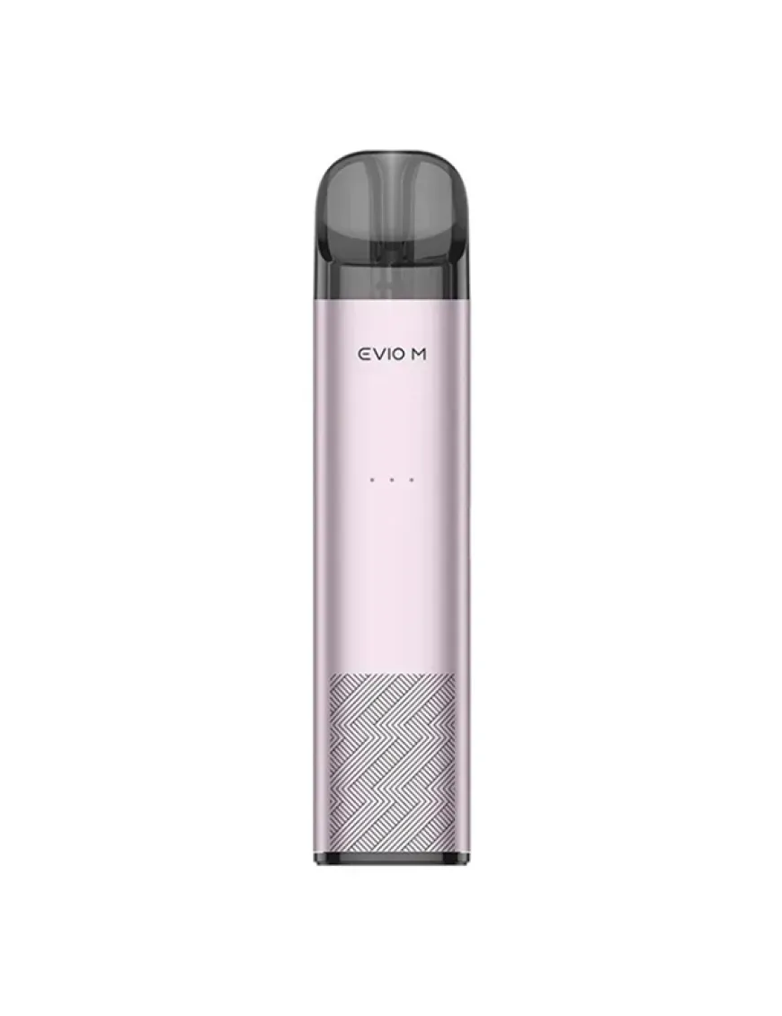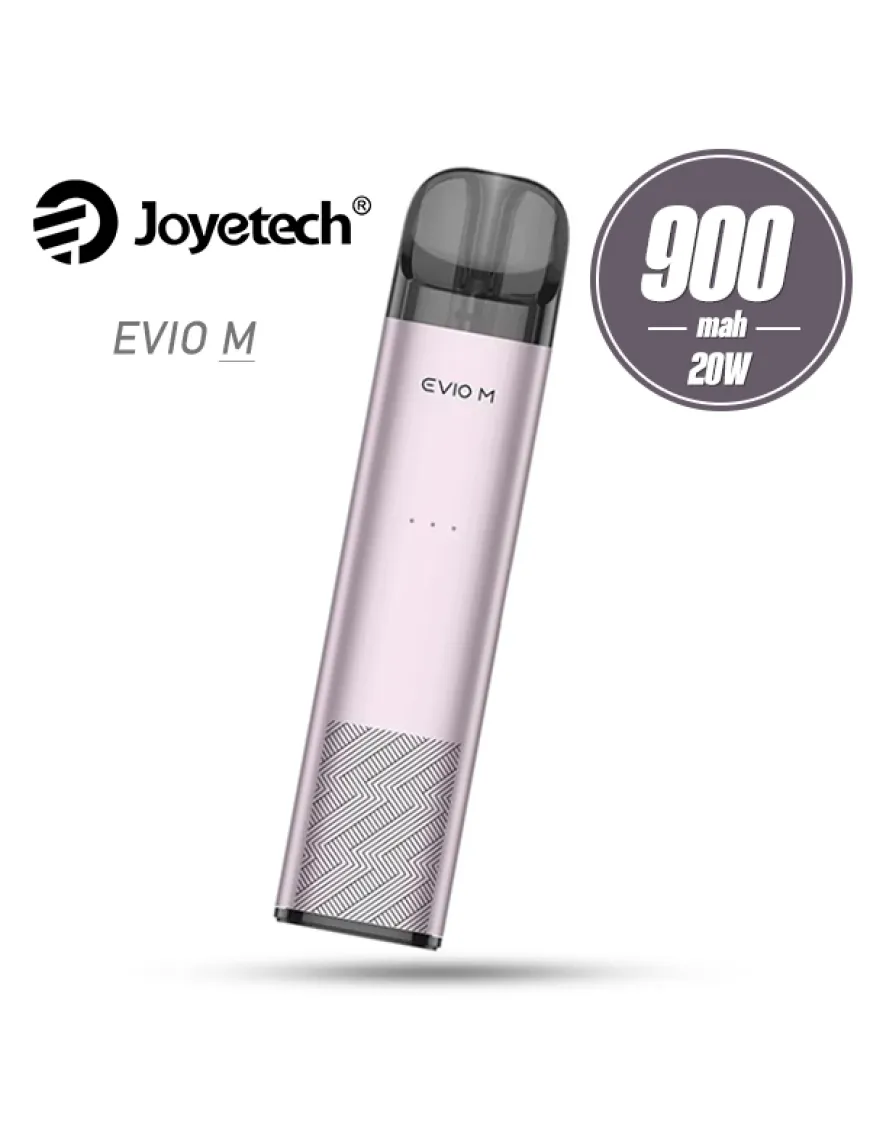 Joyetech Evio M Pod Kit 900 мАг - компактна POD система, оснащена потужним вбудованим акумулятором і розрахована на використання картриджів серії Evio Grip. Корпус пристрою виконаний з алюмінієвого сплаву і має форму приплюснутого стіка без гострих граней. В якості декору використаний геометричний орнамент і логотип бренду – нічого зайвого. Активується пристрій виключно при затягуванні і видає потужність в діапазоні від 13 до 20 Вт відповідно до залишку заряду акумулятора. Індикатор подій виконаний у вигляді декількох точок в центральній частині стіка. Живлення Joyetech Evio M забезпечується вбудованим акумулятором ємністю 900 мАг, зарядка проводиться за допомогою роз'єму USB Type-C, розташованого на одній з бічних граней пристрою, струмом 1А. Комплектний картридж з вбудованим випарником на 0.8 Ом запозичений у старшого брата Joyetech Evio Grip. Резервуар має бічну, не швидкодоступну заправку і вміщує 2,8 мл рідини. Крім того, девайс підтримує ще кілька варіантів картриджів, серед яких є зі змінними випарниками і попередньо заправлені.