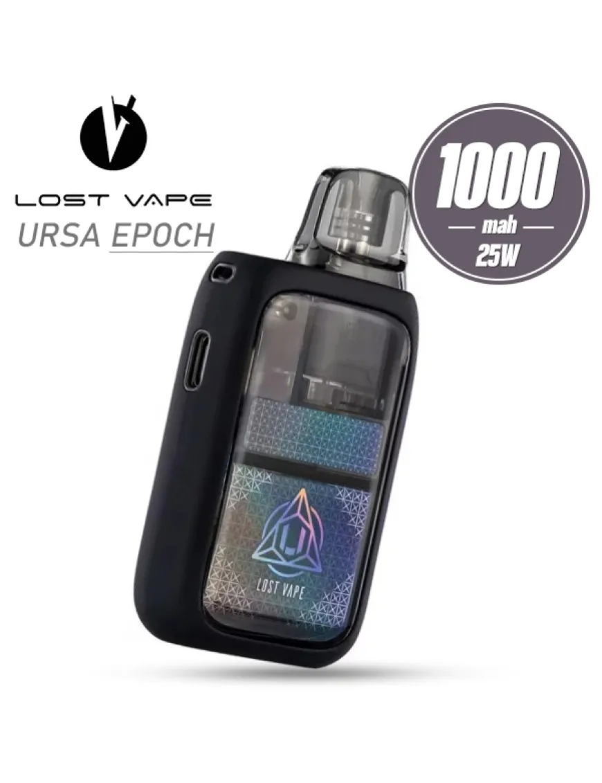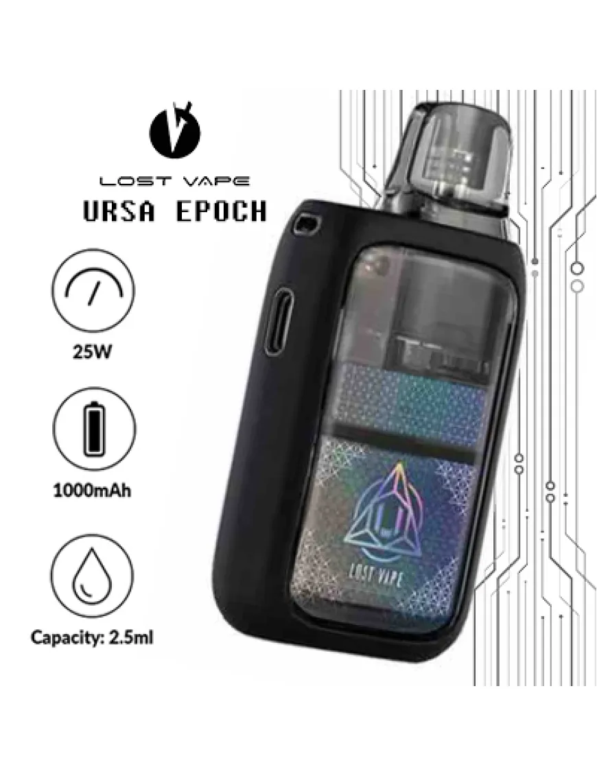 Lost Vape Ursa Epoch Pod Kit 1000 мАг - портативна Pod-система, оснащена потужним акумулятором, автоматичним підстроюванням потужності та настроюваним обдувом. Пристрій виконано в кишеньковому форм-факторі з пластиковим корпусом і ергономічним силіконовим покриттям. Інтерфейс новинки, незважаючи на наявність дрібного монохромного дисплея, безкнопковий - активація досягається винятково за затягуванням. Потужність автоматично підлаштовується під значення опору встановленого картриджа. Живлення Ursa Epoch забезпечується вбудованим акумулятором, ємністю 1000 мАг, а це досить пристойний показник. Зарядка акумулятора здійснюється за допомогою роз'єму USB Type-C, розташованого на нижньому торці пристрою, струмом 1А. Для регулювання інтенсивності затяжки в пристрої передбачено акуратний повзунок на бічному торці пристрою. У комплект пристрою входить один картридж з вбудованим випаровувачем з нової лінійки Ursa V2, але залишилася підтримка і попередніх картриджів серії Ursa..