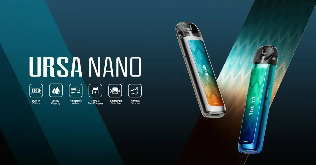Lost Vape Ursa Nano Pod Kit 800 мАг - компактна POD-система, оснащена акумулятором середньої місткості, розрахована на роботу на постійній потужності і призначена для використання змінних картриджів з вбудованими випаровувачами. Форм-фактор, в якому виконано пристрій - досить акуратний стік, з округлими кутами граням, завдяки чому він має чудову ергономіку. Девайс досить невеликий 100.5 х 24.1 х 14 мм, але при цьому не зовсім легкий 61.3 грама, але така вага пояснюється тим, що виготовлений девайс повністю з цинкового сплаву. Живлення Lost Vape Ursa Nano забезпечується вбудованим акумулятором ємністю 800 мАг, що, в принципі, непогано, адже пристрій розрахований на використання картриджів з високим опором, але час автономної роботи безпосередньо залежить від стилю та інтенсивності паріння. Зарядка акумулятора здійснюється за допомогою роз'єму USB Type-C, розташованого на нижньому торці пристрою. Пристрій оснащений максимально простим чипсетом, завдяки якому можна отримати повний комплект захистів і працювати на потужності 5 - 18 Ватт. Індикація здійснюється світлодіодом, прихованим у нижній частині бічної панелі, який змінює свій колір залежно від рівня заряду акумулятора. Активується пристрій під час затягування. Незважаючи на те, що девайс досить компактний, у ньому передбачено регулювання обдування, реалізоване традиційним способом, за допомогою невеликого повзунка, розташованого на бічній поверхні батарейного блока. Комплектний картридж з вбудованим випаровувачем, вміщує в себе 2.5 мл і утримується в пристрої за допомогою магнітів. Для заправки картриджа його необхідно вийняти його з батарейного блока, відкрити силіконову заглушку і залити в нього 2,5 мл рідини.