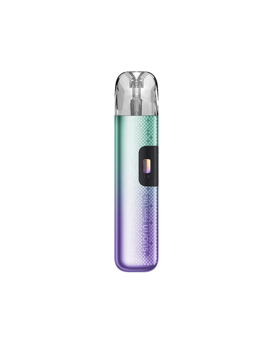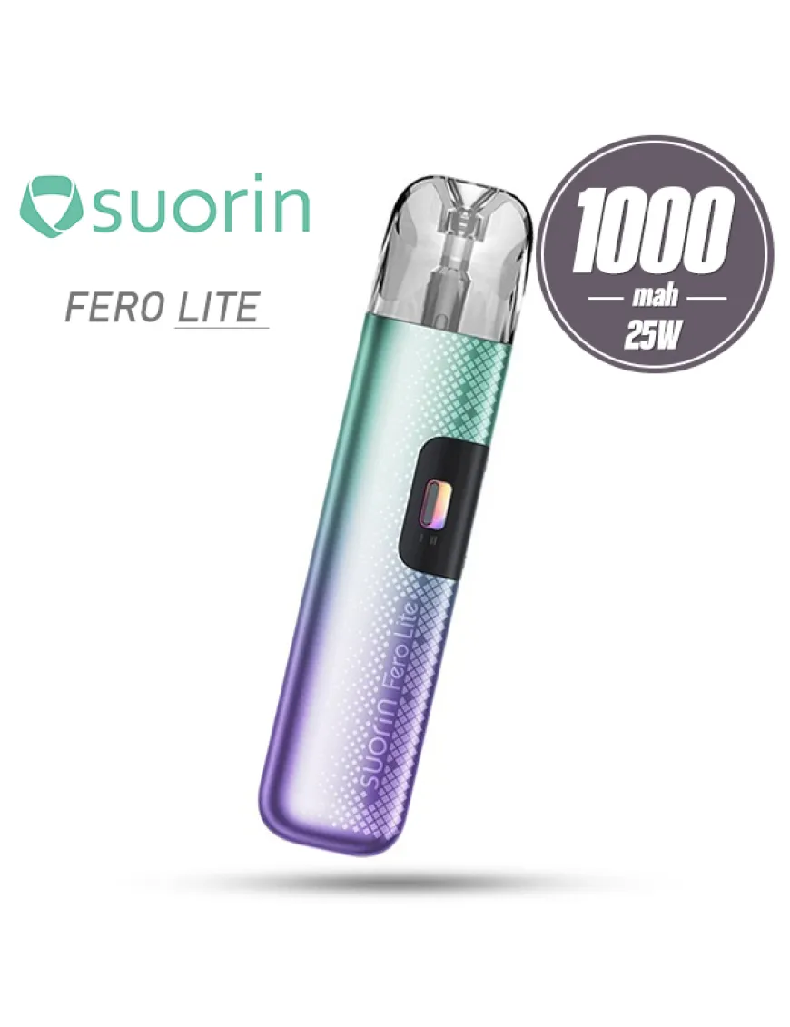 Suorin Fero Lite Pod Kit 1000 мАг - компактна POD система, оснащена потужним акумулятором, регулюванням затяжки і розрахована на використання змінних картриджів з вбудованими випарниками. Корпус пристрою виконаний з алюмінієвого сплаву у вигляді стіка із закругленими кутами. В якості декору використаний симпатичний геометричний візерунок і градієнтне забарвлення деяких версій. Панель управління багата єдиною клавішею, проте активація досягається в тому числі і по затяжці. Крім цього є невеликий монохромний дисплей, оперезаний оригінальною RGB-стрічкою. Живлення Suorin Fero забезпечується вбудованим акумулятором, ємністю 1000 мАг. Зарядка акумулятора проводиться за допомогою роз'єму USB Type-C, розташованого на одній з бічних граней пристрою, струмом 2А. Керуючий чіпсет працює в єдиному доступному режимі – варіватт і має скромний діапазон налаштування потужності до 25Вт. Про регулювання інтенсивності затяжки творці не забули – акуратний повзунок розташований на протилежному боці корпусу. Картриджна система нова, це резервуари хорошої ємності на 3 мл, з бічною не швидкодоступною заправкою. У комплекті Suorin Fero представлені два картриджі з вбудованими сітковими випарниками з опором 0,6 і 0,8 Ом.