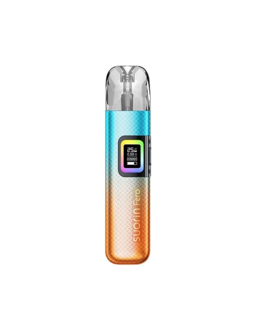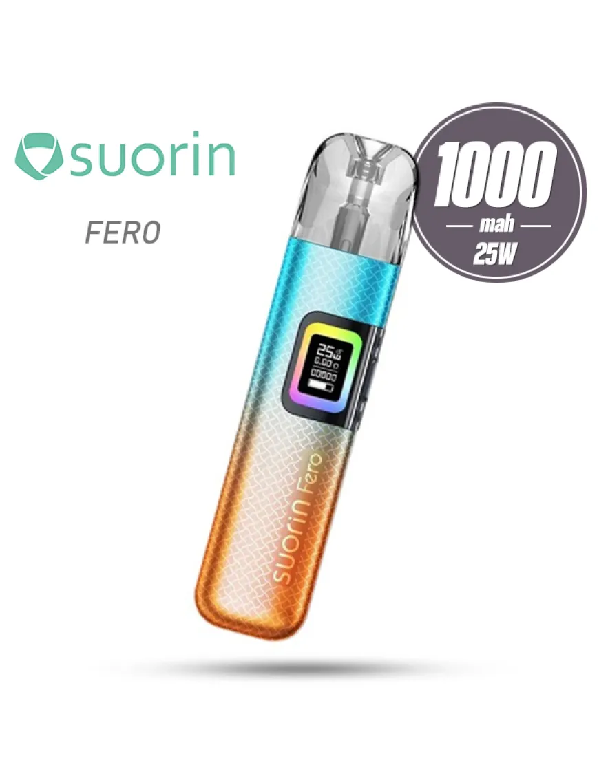 Suorin Fero Pod Kit 1000 мАг - компактна POD система, оснащена потужним акумулятором, регулюванням затяжки і розрахована на використання змінних картриджів з вбудованими випарниками. Корпус пристрою виконаний з алюмінієвого сплаву у вигляді стіка із закругленими кутами. В якості декору використаний симпатичний геометричний візерунок і градієнтне забарвлення деяких версій. Панель управління багата єдиною клавішею, проте активація досягається в тому числі і по затяжці. Крім цього є невеликий монохромний дисплей, оперезаний оригінальною RGB-стрічкою. Живлення Suorin Fero забезпечується вбудованим акумулятором, ємністю 1000 мАг. Зарядка акумулятора проводиться за допомогою роз'єму USB Type-C, розташованого на одній з бічних граней пристрою, струмом 2А. Керуючий чіпсет працює в єдиному доступному режимі – варіватт і має скромний діапазон налаштування потужності до 25Вт. Про регулювання інтенсивності затяжки творці не забули – акуратний повзунок розташований на протилежному боці корпусу. Картриджна система нова, це резервуари хорошої ємності на 3 мл, з бічною не швидкодоступною заправкою. У комплекті Suorin Fero представлені два картриджі з вбудованими сітковими випарниками з опором 0,6 і 0,8 Ом..