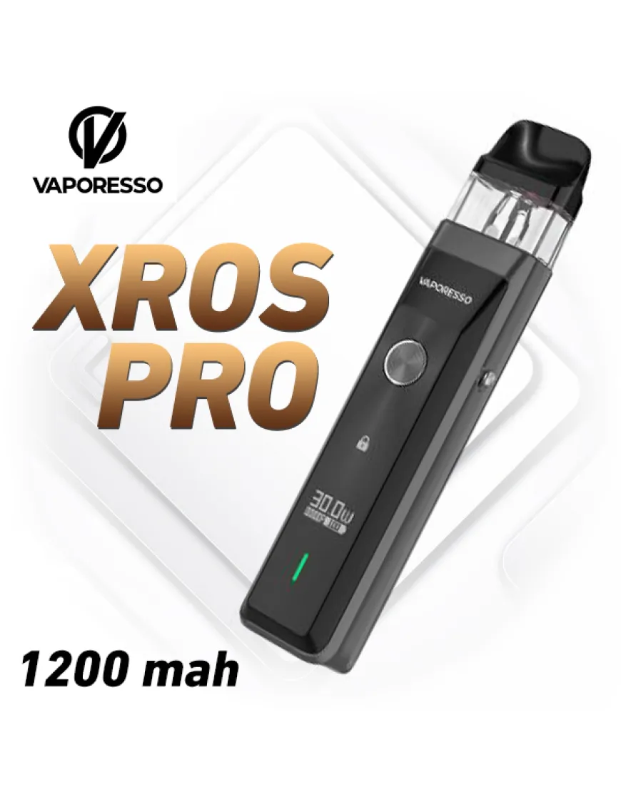 Vaporesso XROS PRO 1200 мАг - Pod система середніх розмірів, з ємним акумулятором, швидкою зарядкою і з підтримкою картриджів XROS Series. Новий пристрій отримав витягнутий прямокутний корпус з алюмінієвого сплаву в лаконічному, але досить оригінальному стилі. На лицьовому боці встановлена кругла кнопка активації, трохи нижче розмістився невеликий монохромний дисплей, а ще нижче розташувався LED бар зі світлом, яке можна налаштувати. Тильна сторона оснащена повзунком регулювання обдування, на одному з торців передбачили зручний елемент швидкого блокування пристрою. Активація пристрою відбувається як під час затягування, так і за допомогою кнопки. Важлива особливість Pod системи, що вона працює під управлінням усім відомого чипа Axon, що підтримує максимальну потужність в 30 ват і вдосконалений режим Super Pulse, а також режим економії. Живлення Vaporesso XROS PRO забезпечується вбудованим акумулятором, ємністю 1200 мАг, а це досить пристойний показник. Зарядка акумулятора проводиться за допомогою роз'єму USB Type-C, струмом 2А. Одна з ключових особливостей Vaporesso XROS PRO Pod Kit в тому, що в нього можна встановлювати будь-які картриджі серії XROS, завдяки чому не виникне складнощів з пошуком витратних матеріалів. Однак для даної новинки, виробником був створений новий картридж з вбудованим сітковим випаровувачем вельми низького опору - 0.4 Ом (в комплекті 2 шт). Новий картридж отримав ємність 3 мл, швидке верхнє заправлення і фірмову систему захисту від протікання.