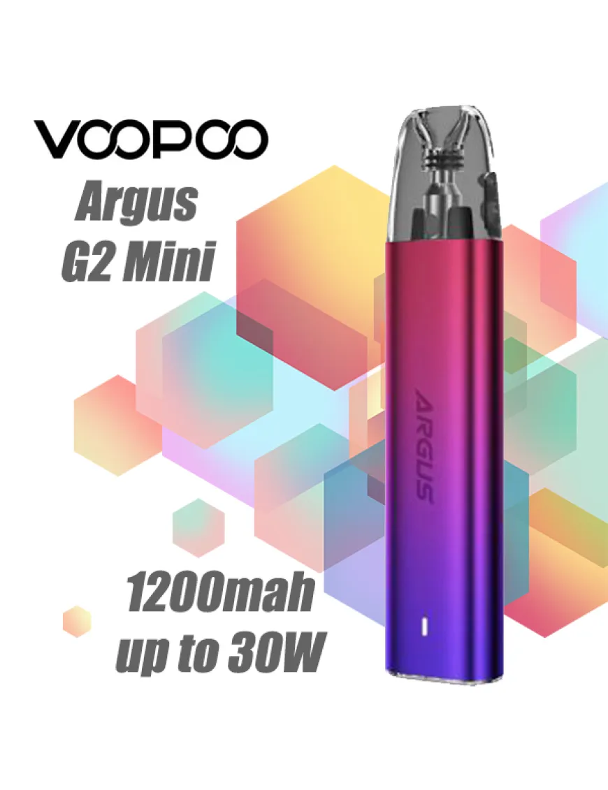 Voopoo Argus G2 Mini Pod Kit 1200 мАч - компактна POD система з потужним акумулятором, автоматичним підстроюванням потужності та настроюваним обдувом. Pod система виконана у вигляді стіка, корпус виготовлений з алюмінієвого сплаву. Інтерфейс новинки безкнопковий, активується за допомогою датчика затяжки. Передбачена LED-індикація, невеликий світлодіод біля основи. Нижній торець виконаний з напівпрозорого пластика - туди індикація також дублюється. На тильному боці розташований повітрозабірний отвір, доповнений маленьким регулятором інтенсивності затяжки. Живлення Voopoo Argus G2 Mini Pod Kit забезпечується вбудованим акумулятором підвищеної ємності 1200 мАг, потужність на виході регулюється автоматично, залежно від опору випаровувача, в межах від 5 до 30 Вт. Зарядка акумулятора здійснюється за допомогою роз'єму USB Type-C, розташованого на нижньому торці пристрою, струмом 1А. Картриджна система повністю оновлена - це витратні матеріали на вбудованих випаровувачах Argus Top Fill Cartridge з тривалим «життєвим циклом», збільшеним об'ємом 3 мл і бічним, проте тепер швидкодоступним, заправленням. Voopoo Argus G2 Mini повністю сумісний з попередніми картриджами серії Argus.