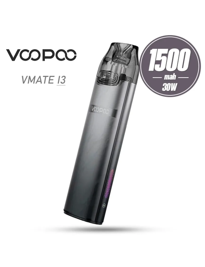 Voopoo VMATE i3 Pod Kit 1500 мАг - чергова оновлена модель лінійки VMATE від компанії Voopoo. Корпус новинки виконаний у впізнаваному корпоративному стилі з алюмінієвого сплаву у формі того ж приплюснутого стіка. Інтерфейс VMATE i3 безкнопковий – активація досягається виключно затяжкою. В якості індикатора подій тепер використовується неоновий LED-лайтбар, який одночасно виконує декоративну функцію і інформує про заряд акумулятора. Розташований індикатор на одній з боковин пристрою. Регулювання інтенсивності затяжки реалізовано за допомогою акуратного повзунка на одній зі сторін пристрою. Завдяки збільшеним габаритам творцям вдалося реалізувати більш ємний вбудований елемент живлення на 1500 мАг, а також збільшити максимальну потужність до 30 Вт. Заряджається пристрій за допомогою сучасного роз'єму USB Type-C, розташованого на нижньому торці пристрою, струмом 2А. Картриджна система вже знайома - це витратні матеріали на вбудованих випарниках VMATE Top Fill Cartridge з швидкою бічною заправкою, хорошою місткістю, тривалим терміном служби, а також вдосконаленою системою захисту від протікання. Новинка комплектується картриджем VMATE Top Fill Cartridge 0,7 Ом 3 мл і повністю сумісна з усіма витратами серій VMATE Top Fill і VMATE V2.