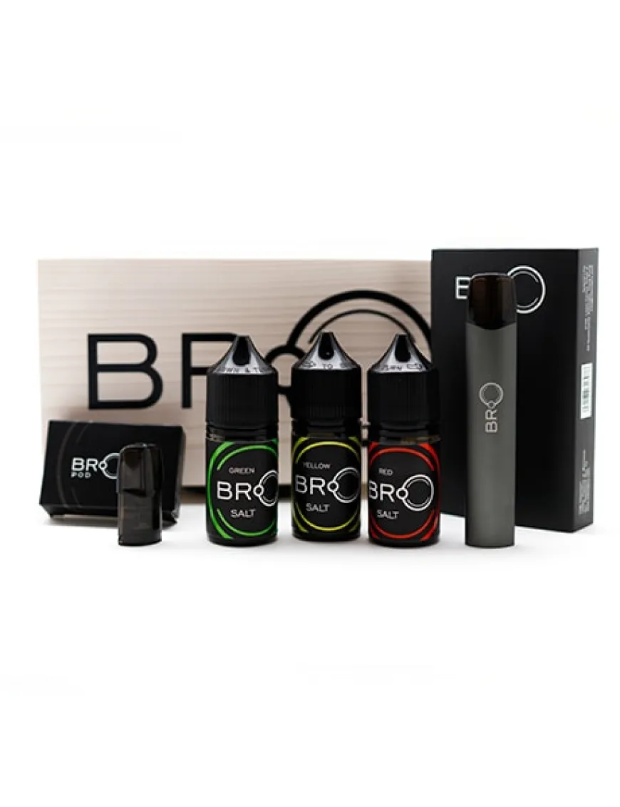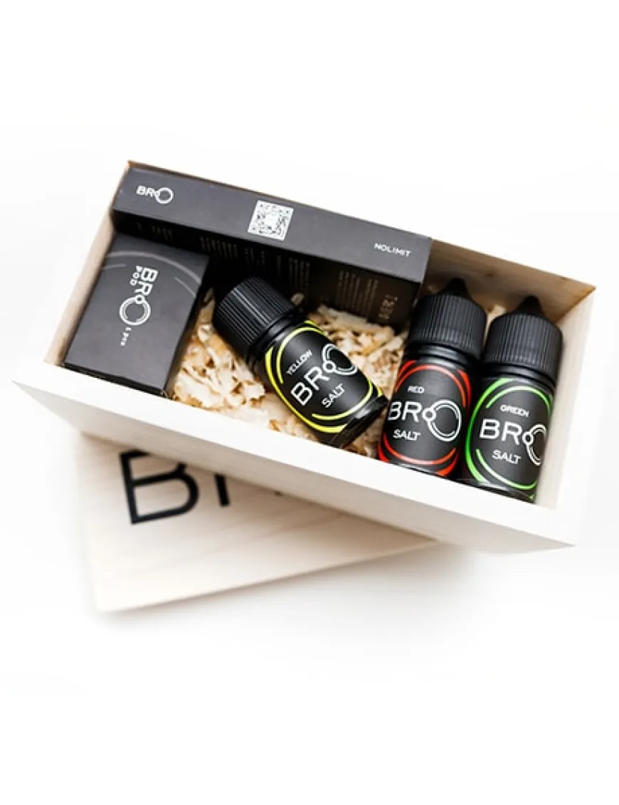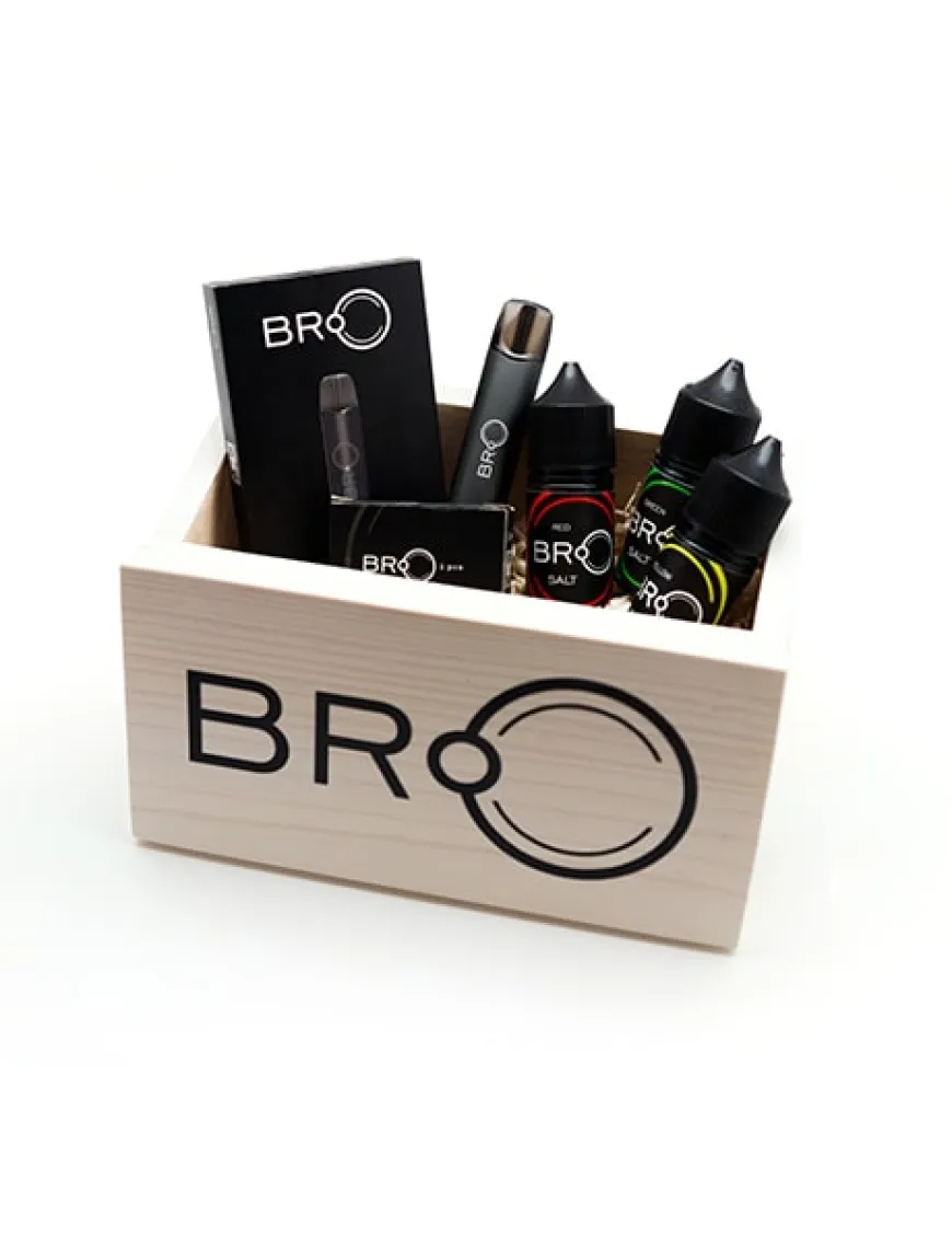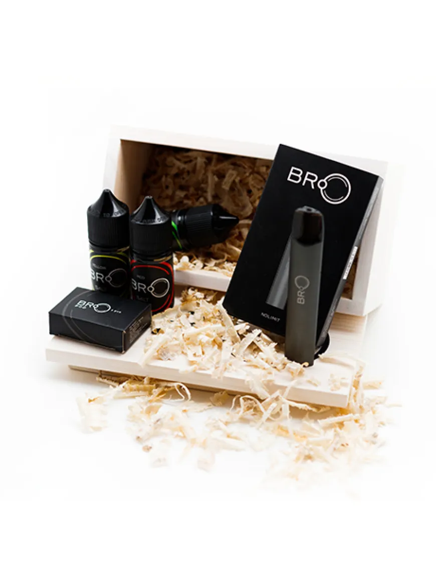 Подарунковий набір BRO – це чудове придбання для дорослих курців. У комплект входить якісна та стильна Pod система BRO, змінний картридж та лінійка рідини BRO на сольовому нікотині, що складається з трьох фруктових смаків із міцністю 30мг/мл. Все упаковано у красиву дерев'яну коробку.