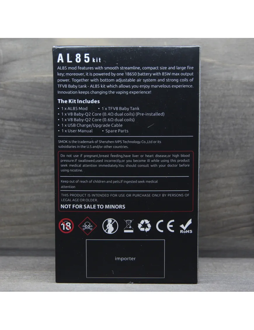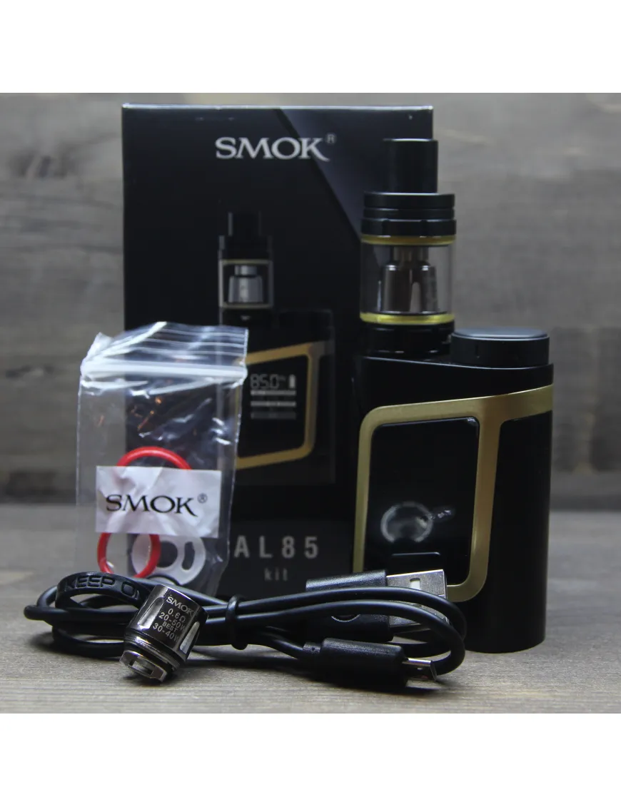 Корпус боксмоду виконаний із цинкового сплаву чорного кольору з кольоровими декоративними вставками. Апарат має гідний зовнішній вигляд, компактні розміри та обладнаний рідкокристалічним дисплеєм. Кнопка FIRE розташована на всю бічну частину боксмоду, але натискається тільки зверху. Боксмод може розвивати потужність до 85 Вт, має безліч різних режимів роботи, а також практично всі варіанти захисту. Стартовий набір дуже зручний в експлуатації, оснащений верхнім варіантом заправки, змінними випарниками, 510 конектором. До того ж Smok AL85 – забезпечує відмінну смакопередачу, чим порадує практично будь-якого свого власника.