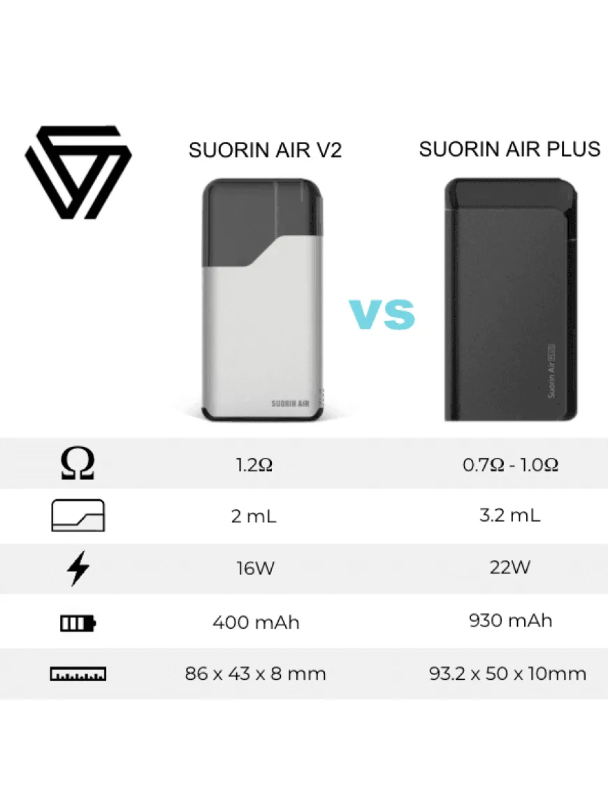 Suorin випустив Suorin Air Plus Kit, оновлену версію популярних Suorin Air. Новий комплект містить кілька оновлень, у тому числі покращену продуктивність, велику ємність для рідини, велику вбудовану батарею та картриджі для паріння сольових та звичайних рідин.