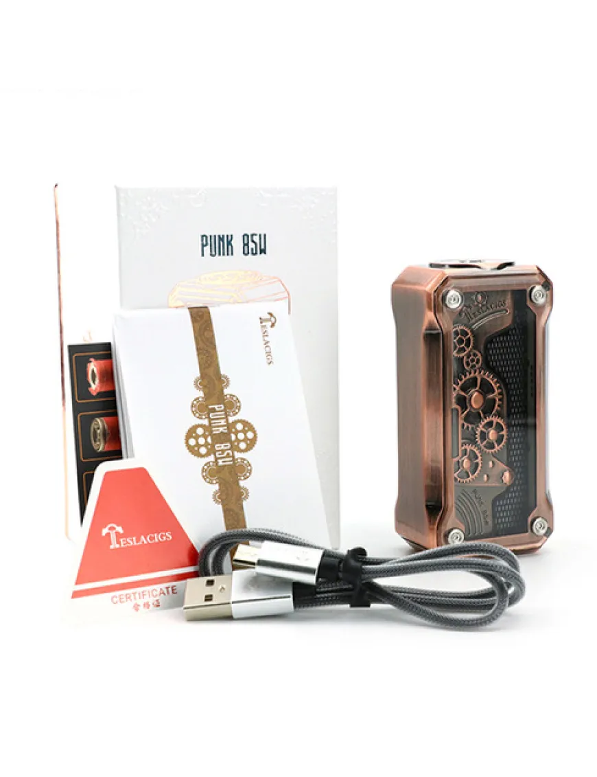 Tesla Punk Mini 85W TC – чергова модель від компанії Tesla, зроблена в стилі стим-панку, шанувальників якого не так вже й мало. Щодо свого "старшого брата" (Tesla Punk 220W) девайс менший майже вдвічі, має потужність 85 Ватт і працює від одного акумулятора 18650 (у комплект не входить). Конектор на пристрої 510 розмір майданчика для посадки атомайзера - 25 мм. Кришка для акумуляторного відсіку розташована внизу, при цьому вона має два магніти, що дозволяють максимально захистити девайс від випадкового відкриття. Дизайн у стилі стим-панк доповнюють прозорі панелі на бокових сторонах, що підсвічуються світлодіодами. Роз'єм micro-USB дозволить зарядити пристрій і за потреби оновити прошивку.