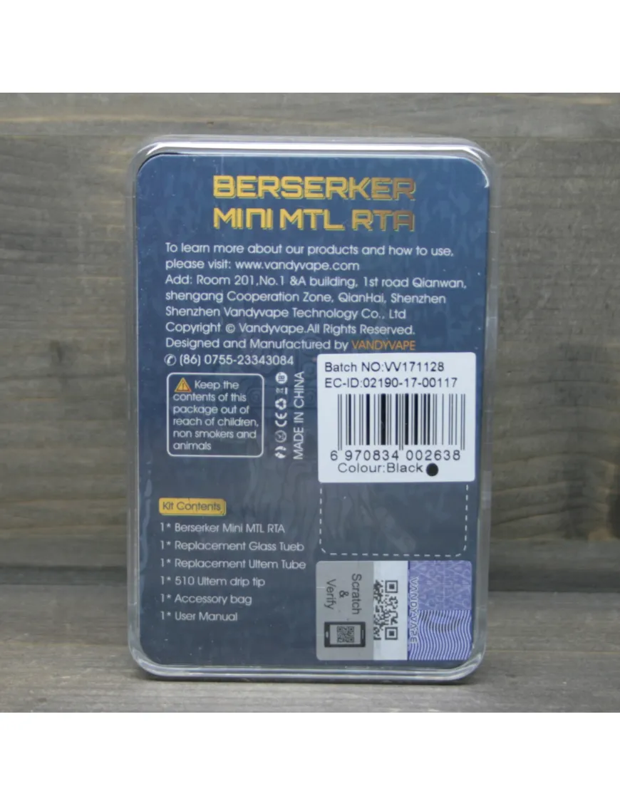 Berserker Mini є 22-міліметровим резервуаром і вміщує 2 мл рідини. Має три комплекти секції бака; Попередньо встановлена секція бака із нержавіючої сталі, секція бака обдування та секція скляного бака.