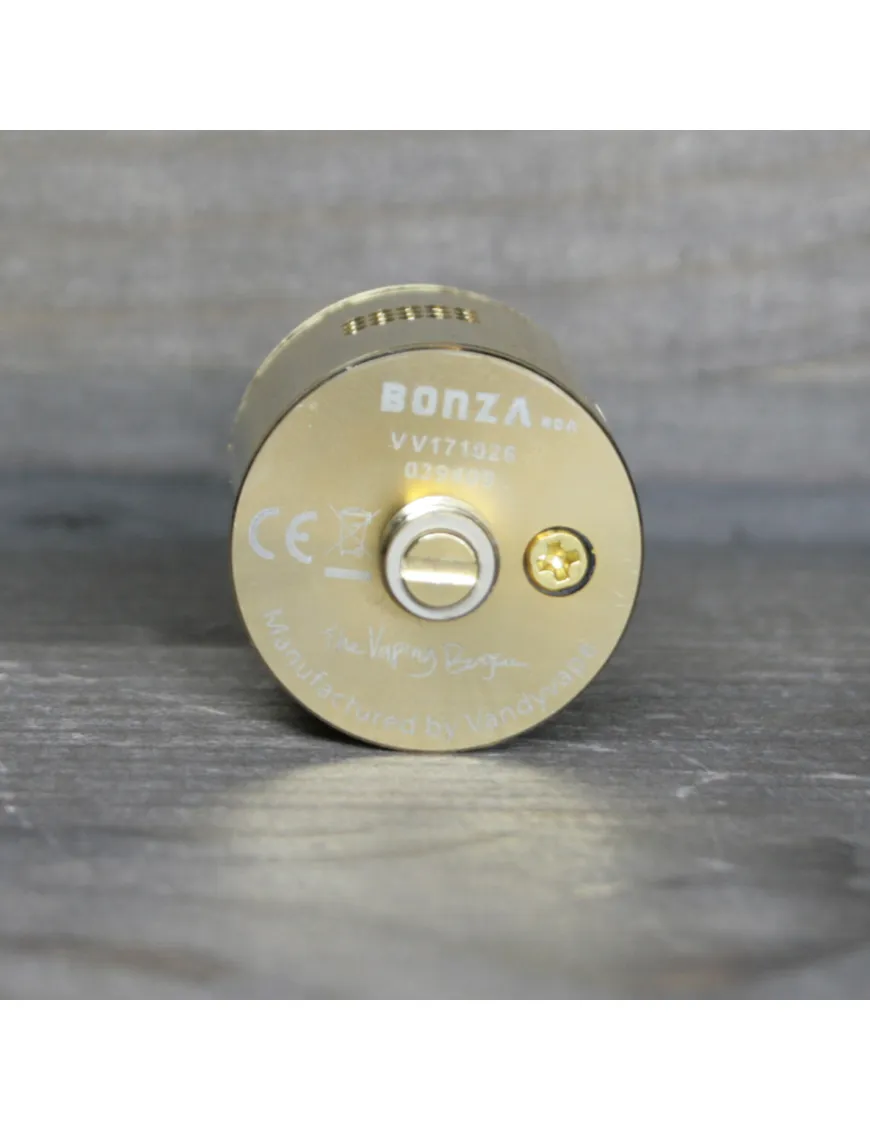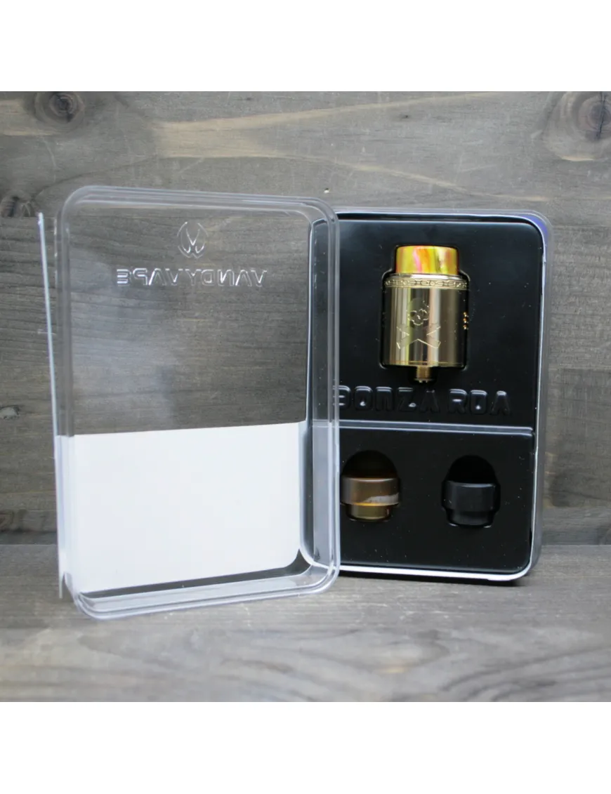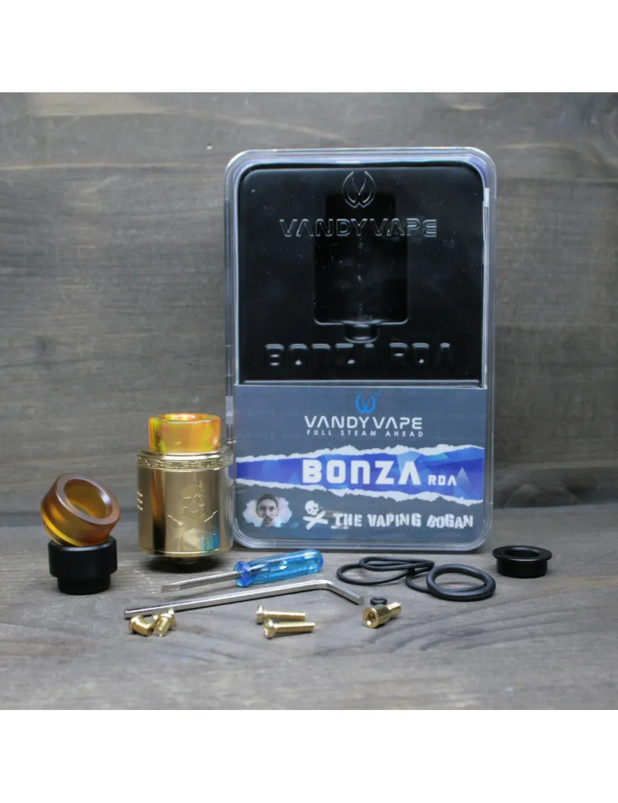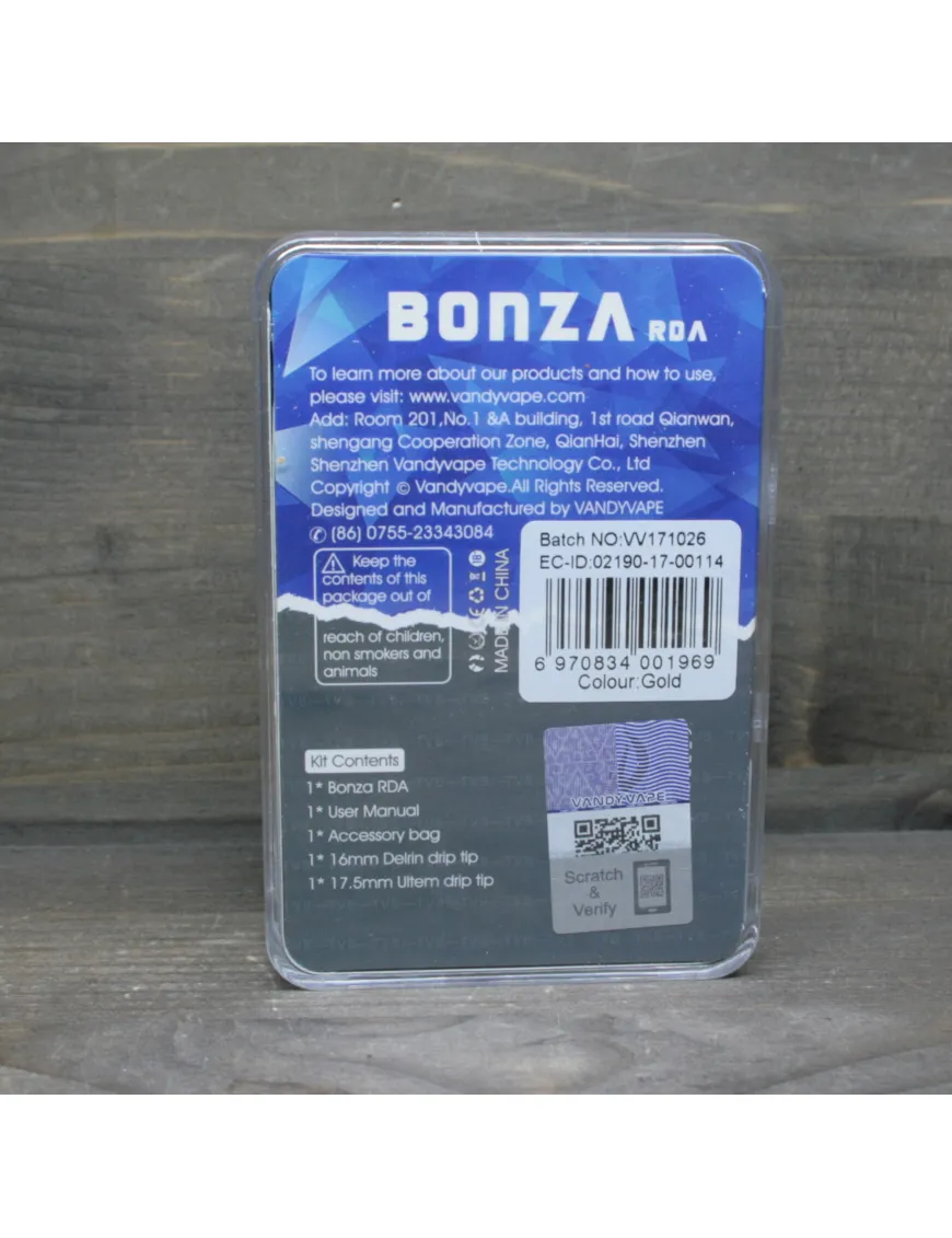 Bonza RDA виконана з нержавіючої сталі. Можлива у чотирьох кольорах 6 сталевий, золотий, райдужний, чорний. Має 810-у і 510-у посадку під дрип-типи. Можливість регулювання бокового обдування для однієї та двох спіралей. Двома стійками на чотири гвинти та дві пластини з нижнім затискачем. Глибина ванни в дріпці 8 мм. Також передбачена можливість використання на сквонк модах.