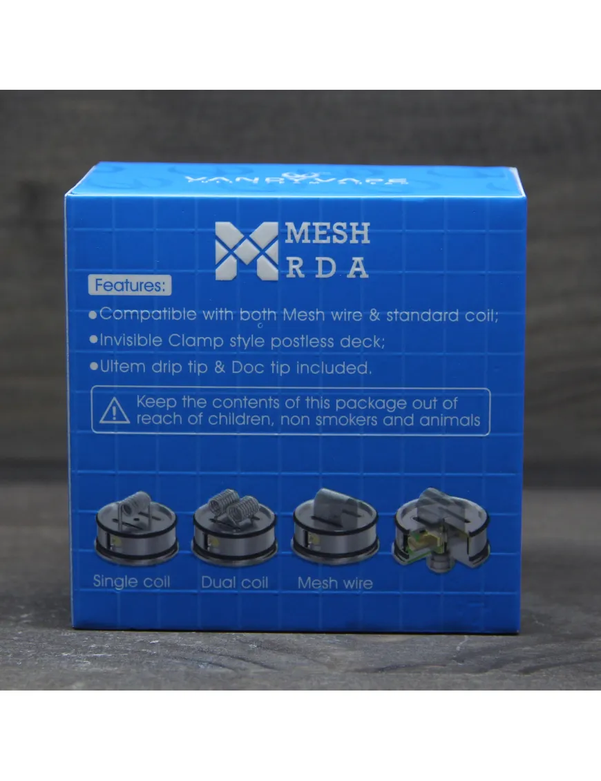 Mesh RDA виконаний з 304 нержавіючої сталі. Представлений у двох кольорах. Має можливість посадки 810 і 510 дріп-типів. Обдув регульований бічний двосторонній. Дріпка розрахована на використання на металевій сітці.