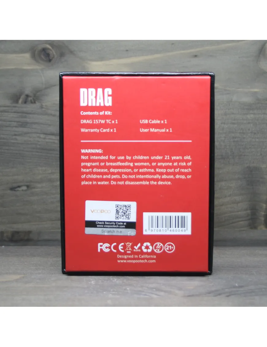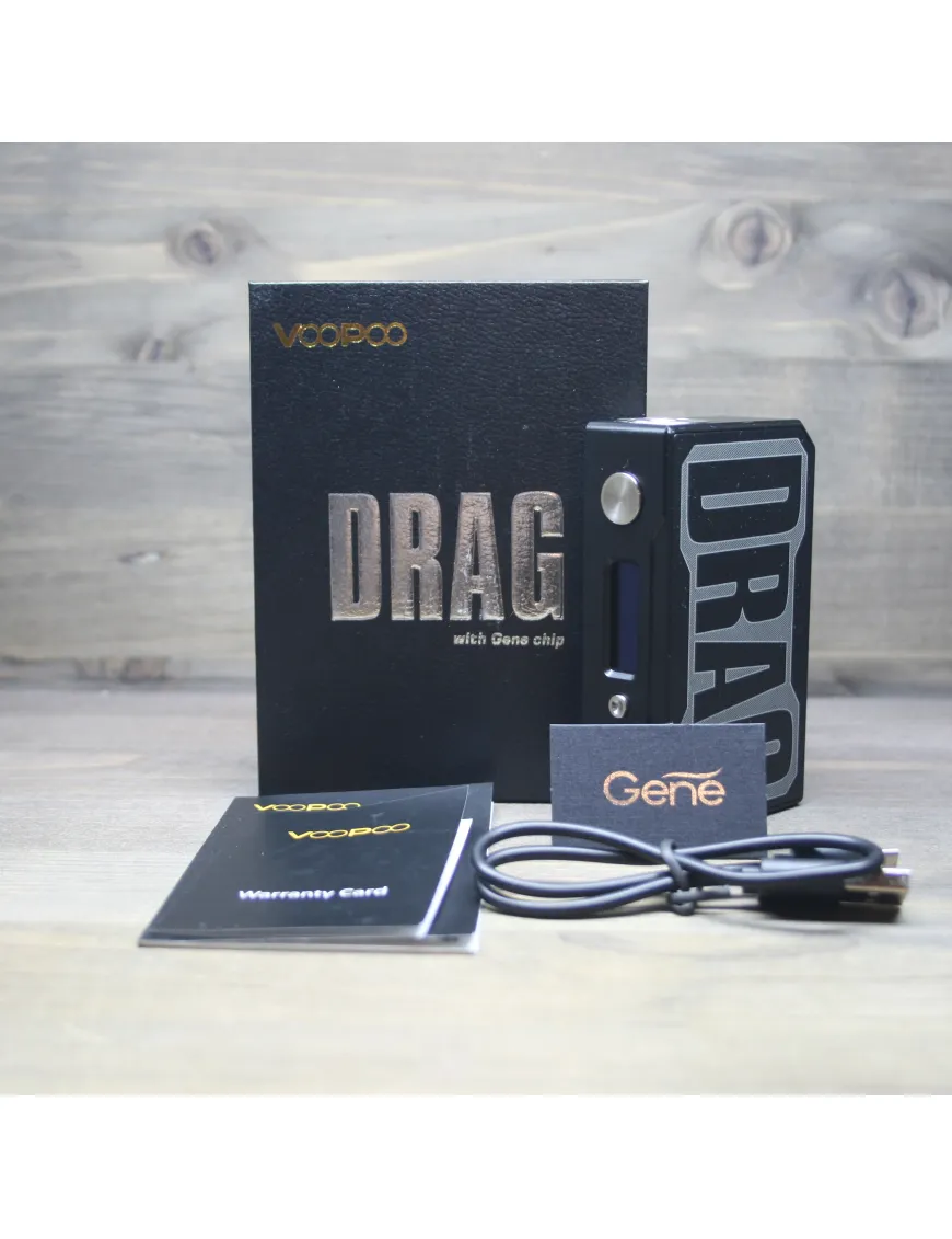 Корпус виконаний із нержавіючої сталі. Напис DRAG нанесений на бічну панель підкреслює оригінальність девайсу. Зверху лицьової частини розташована велика кнопка FIRE круглої форми, під нею монохромний дисплей та кнопки управління меню, знизу встановлений порт microUSB для прошивки та заряду девайсу (рекомендуємо придбати спеціальний зарядний пристрій для акумуляторів). Потужний та стильний батарейний блок, що має моментальну реакцію на кнопку "Fire", величезною кількістю налаштувань і чудовим зовнішнім виглядом;