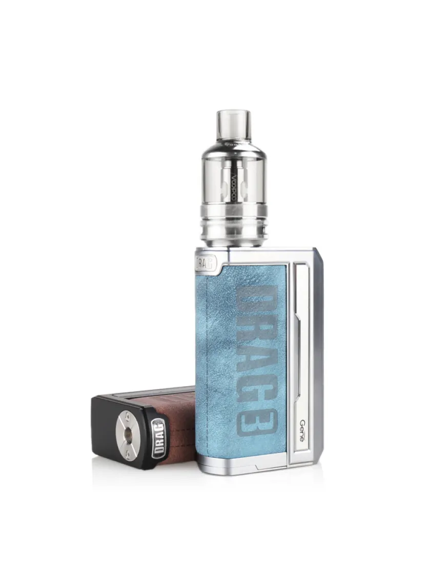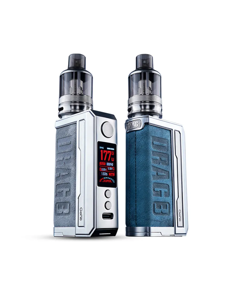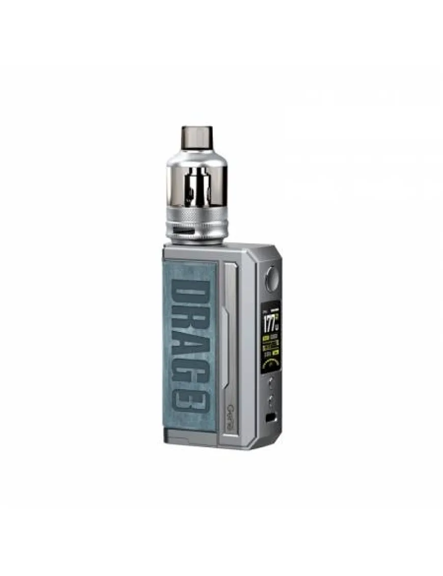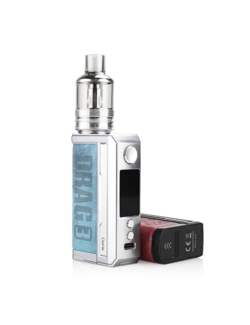 VOOPOO DRAG 3 177W TC Kit with TPP Tank витриманий у традиційному корпоративному стилі бренду VOOPOO, звичному для шанувальників продукції фірми. Масивний прямокутний корпус боксмоду VOOPOO DRAG 3 177W TC Kit with TPP Tank з цинкового сплаву покритий напиленням, а декоративна накладка з екошкіри надає виробу імпозантного вигляду.
