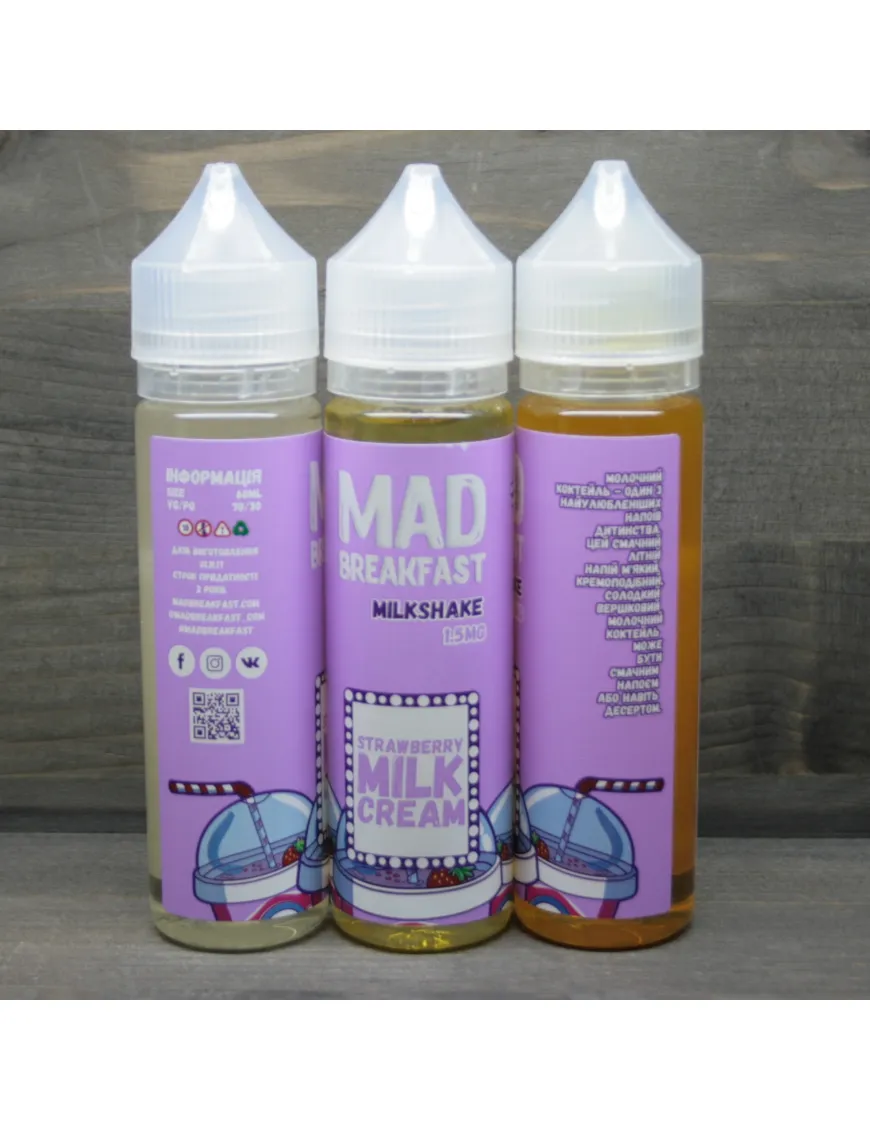 Рідина від Mad Breakfast зовсім недавно з'явилася на ринку, але якість рідини та яскравий дизайн змусили говорити про себе. Заворожує буквально з першої затяжки і припала до смаку, що вейперам віддають перевагу солодким і ягідним рідинам. Виробляється вона на території України і не поступається американським рідинам преміум класу. І це завдяки співвідношенню ціна якість, коли вейпер за невелику плату отримує смачну та якісну рідину.