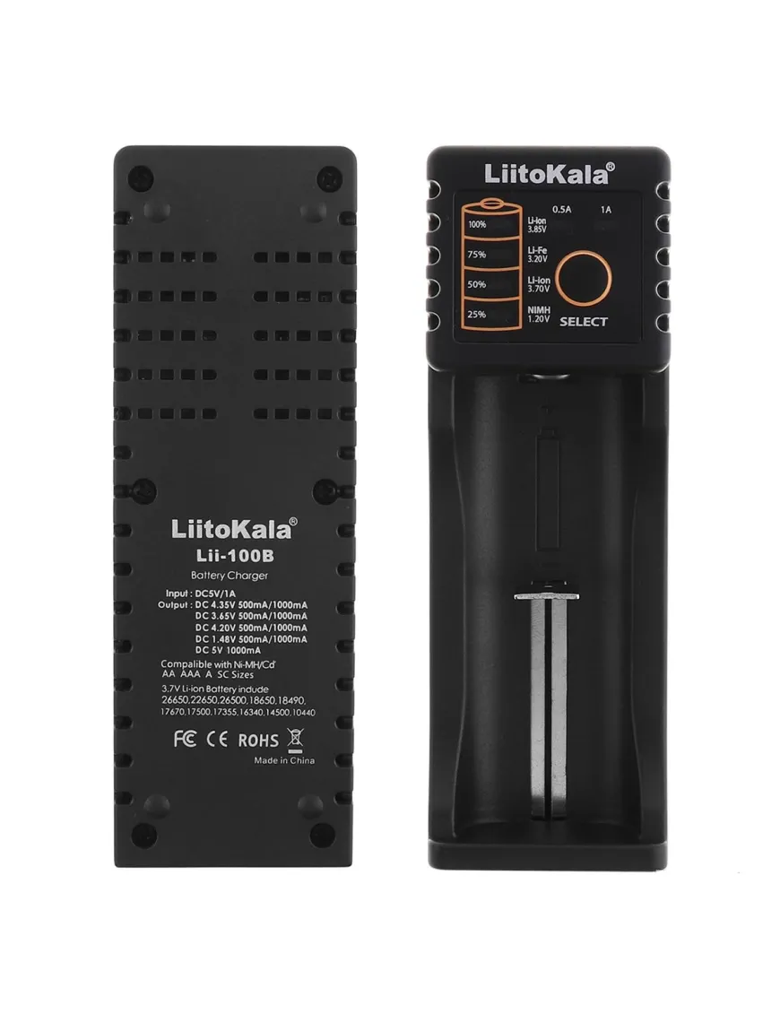 LiitoKala Lii-100B - універсальний інтелектуальний зарядний пристрій, сумісний практично з усіма циліндричними акумуляторами, що усуває необхідність використання декількох зарядних пристроїв. Lii-100 автоматично розпізнає літій-іонні, нікель-металгідридні та нікель-кадмієві акумулятори, заряджає літій-фосфатні (LiFePO4) акумулятори, а також Li-ION акумулятори з кінцевою напругою 4,35в.