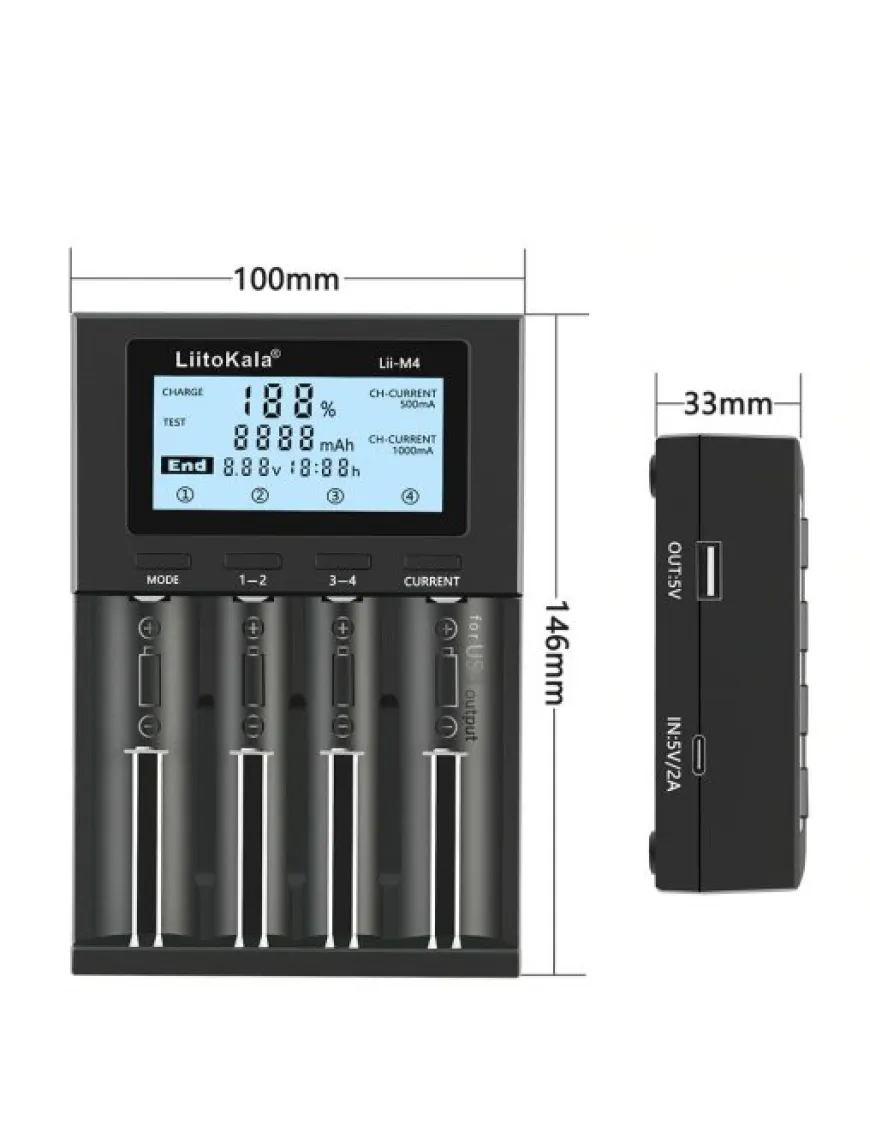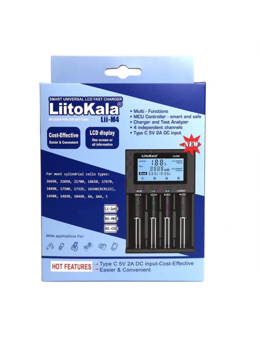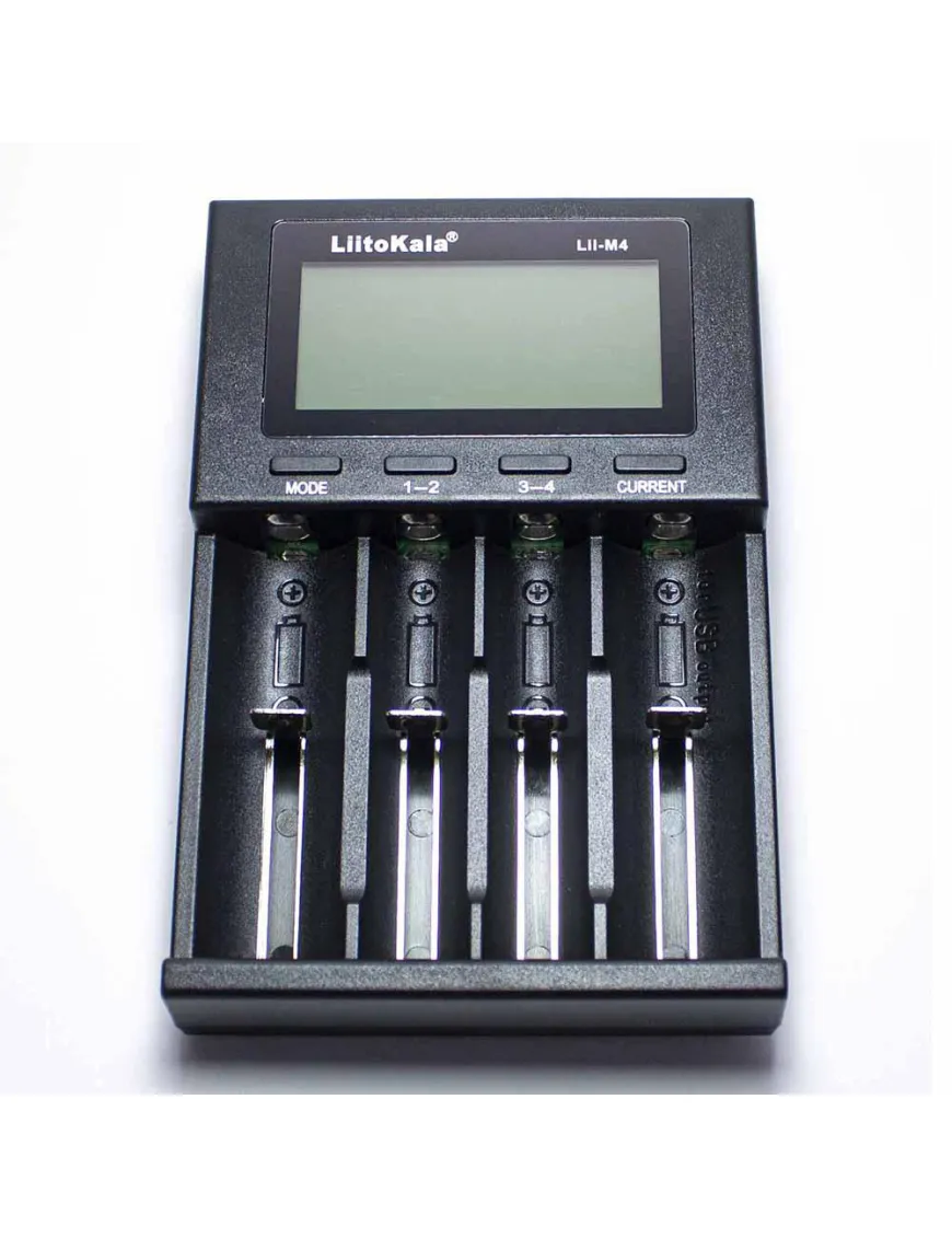 Універсальний зарядний пристрій Liitokala Lii-M4 – це здешевлена модель лінійки Lii-600 та Lii-500 за рахунок використання живлення від USB замість зовнішнього блока живлення. Є функції тестування акумулятора та powerbank (тільки літій у 4м слоті).