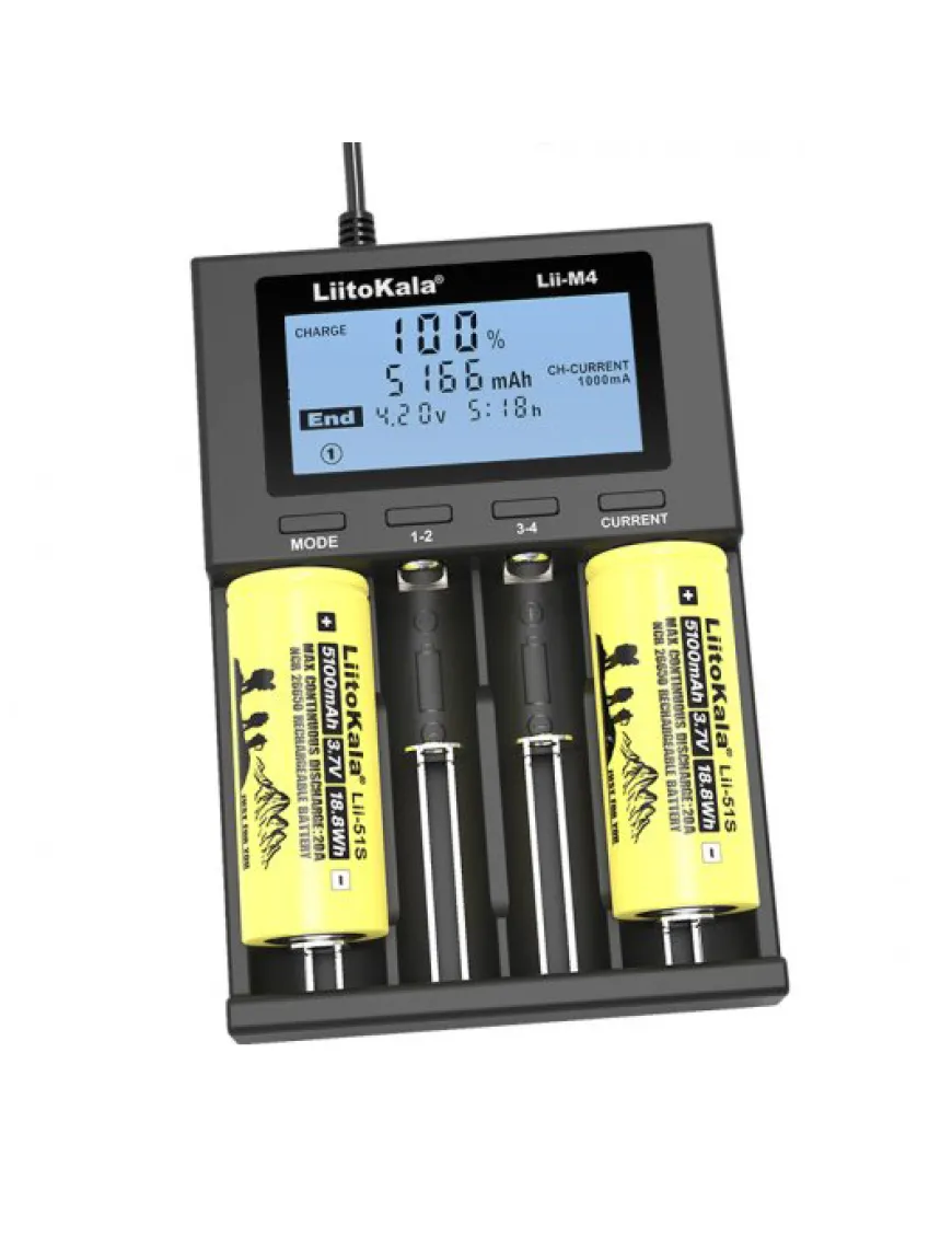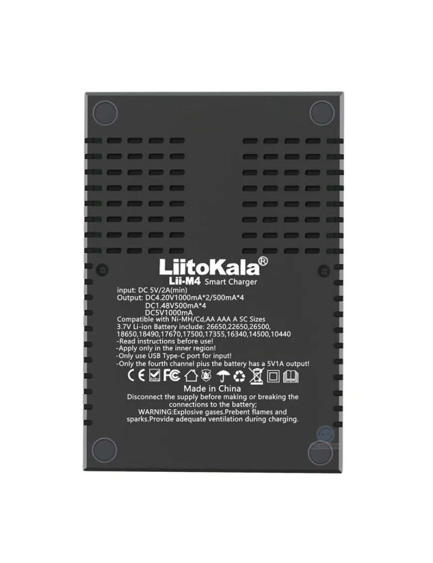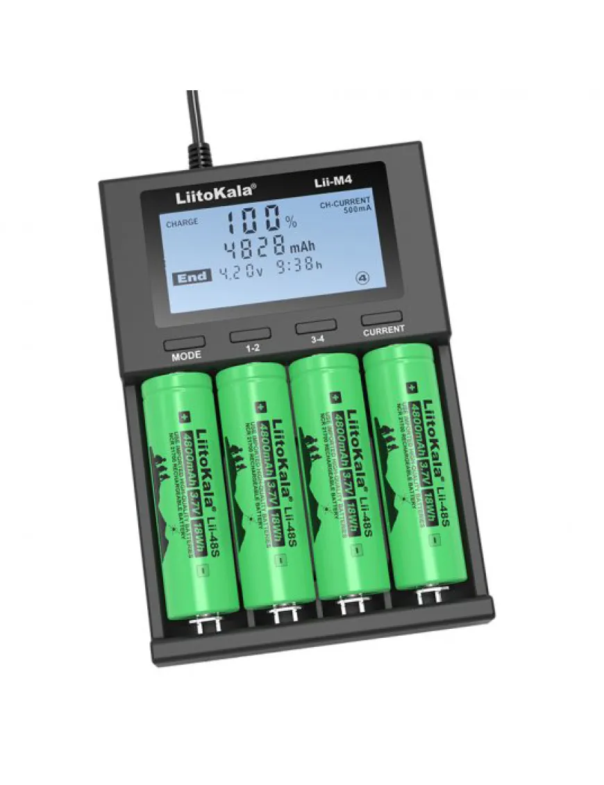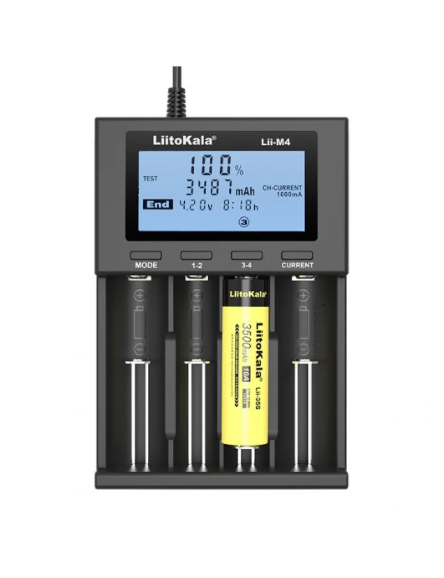 Універсальний зарядний пристрій Liitokala Lii-M4 – це здешевлена модель лінійки Lii-600 та Lii-500 за рахунок використання живлення від USB замість зовнішнього блока живлення. Є функції тестування акумулятора та powerbank (тільки літій у 4м слоті).