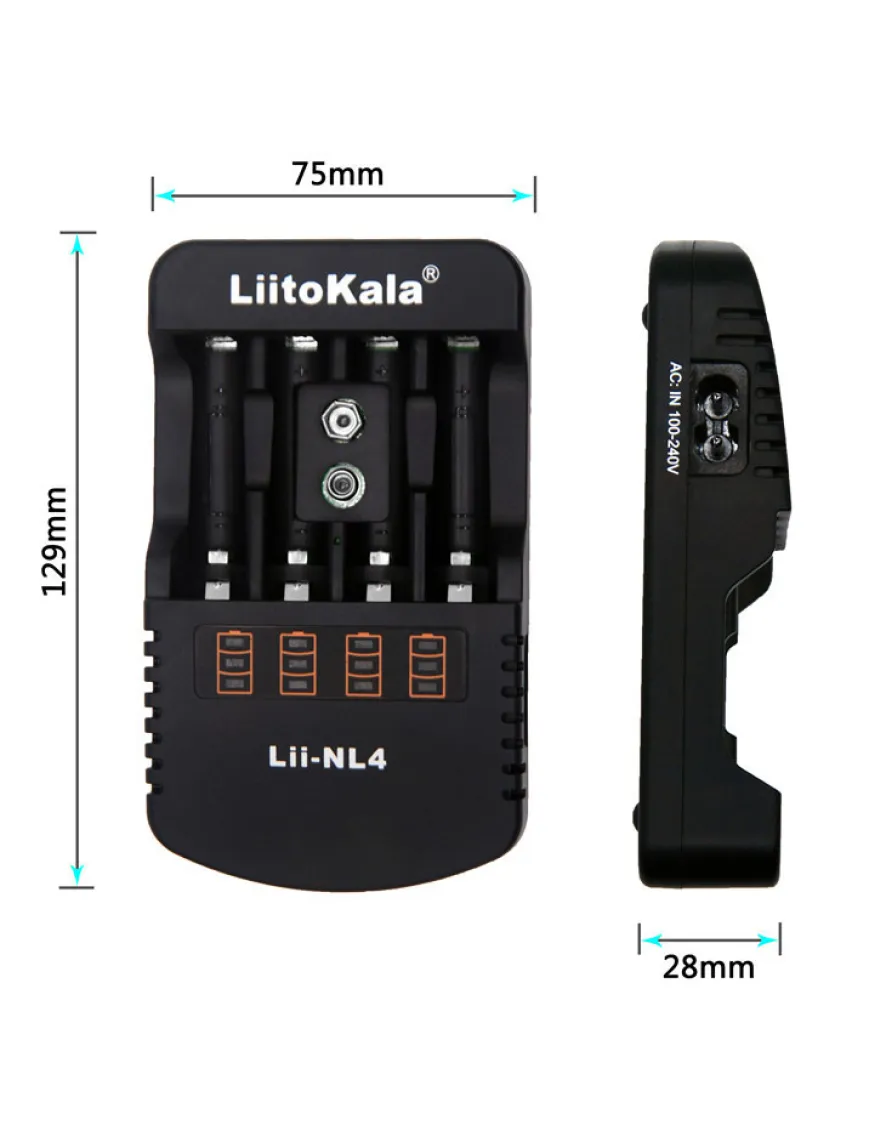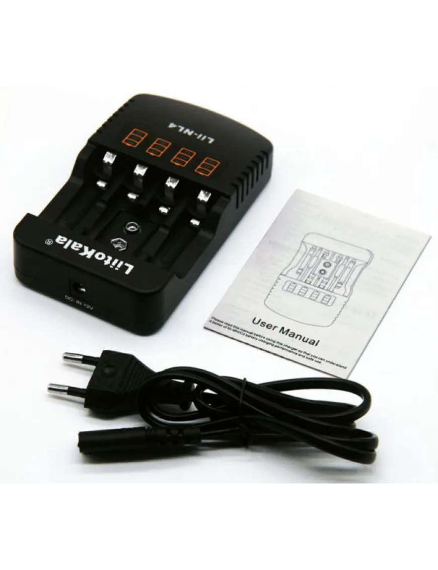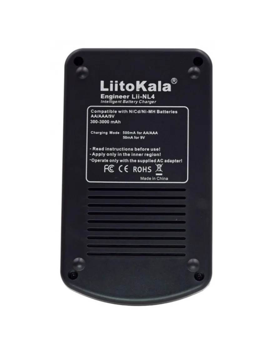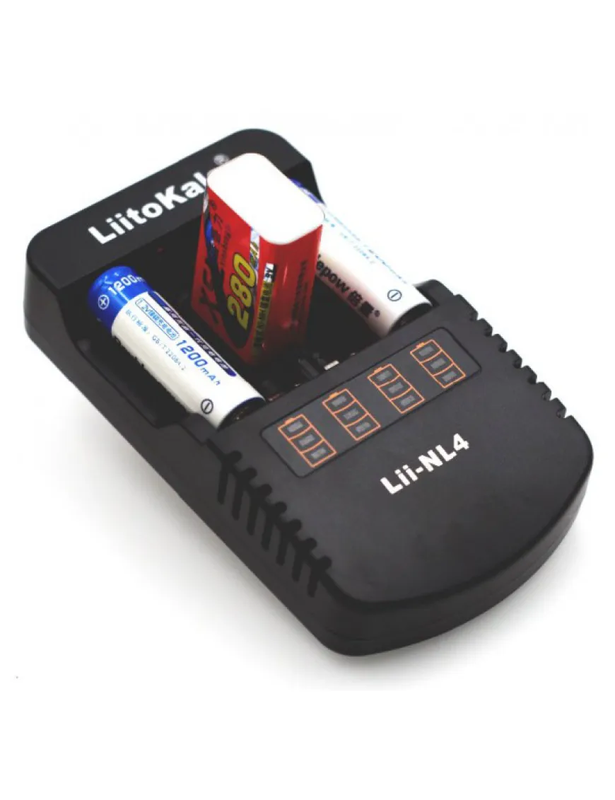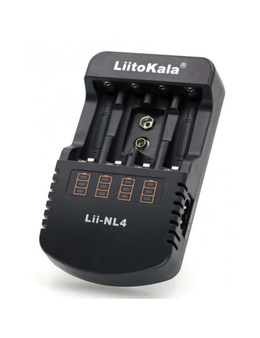 LiitoKala Lii-NL4 має 4 незалежні канали для заряджання акумуляторів NiMH/NiCd, типорозміру АА та ААА (можна заряджати від 1 до 4 акумуляторів), а також один канал для заряджання акумулятора Крона 9V.
