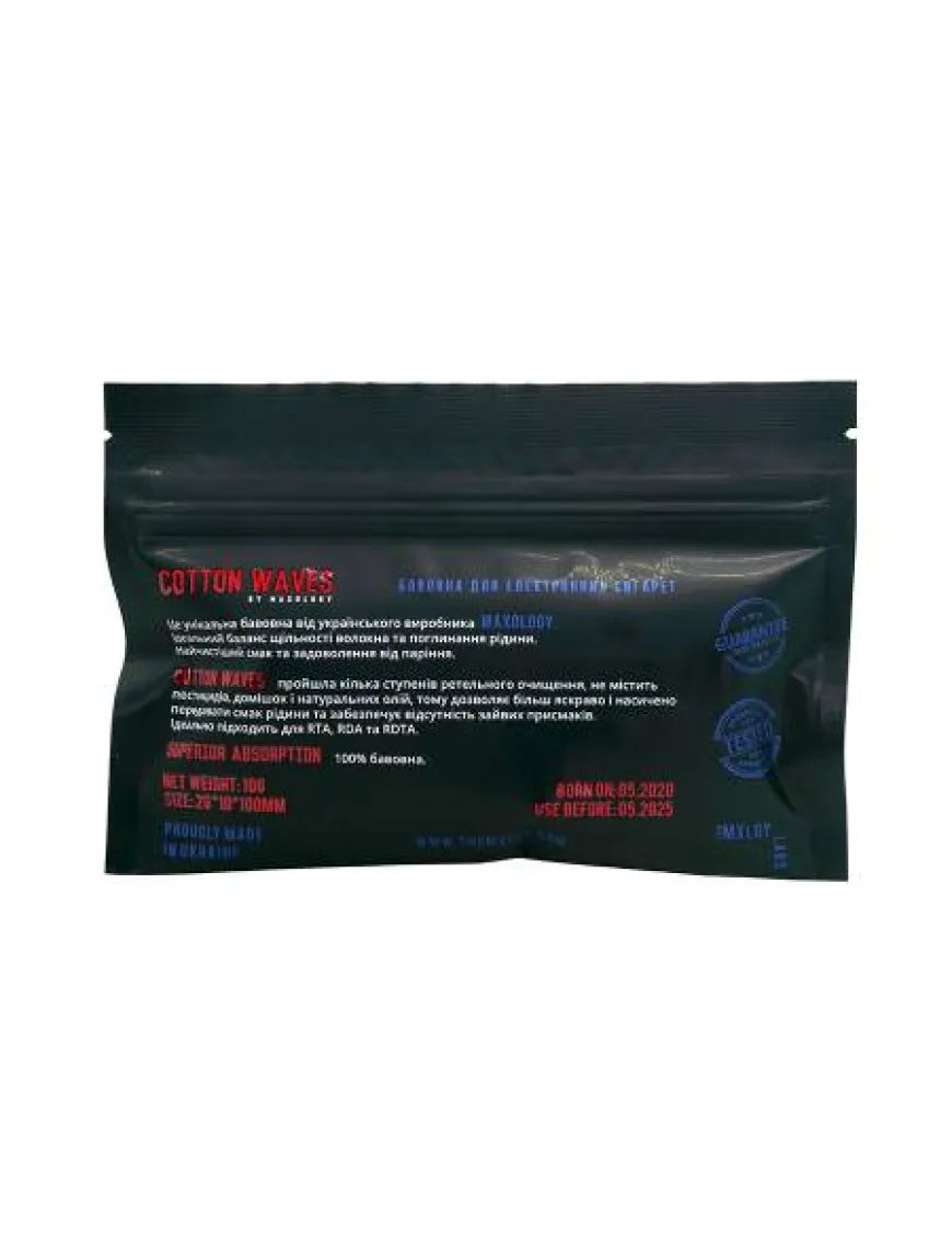 Бавовна Cotton Waves пройшла кілька щаблів ретельного очищення, не містить пестицидів, домішок і натуральних масел, тому дозволяє яскравіше і насичено передавати смак рідини і забезпечує відсутність зайвих присмаків. Ідеально підходить для RTA, RDA та RDTA.
