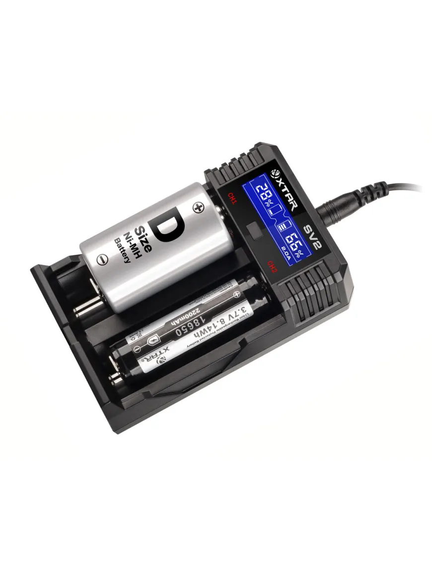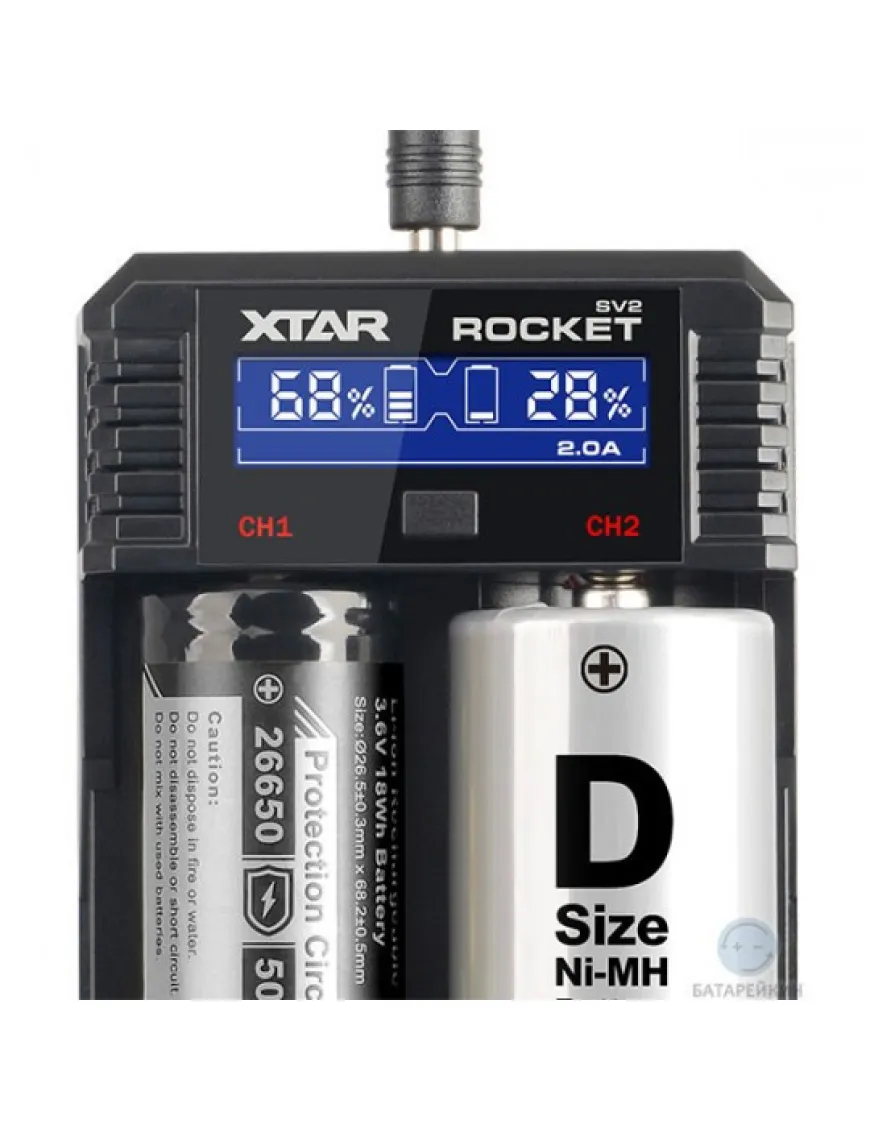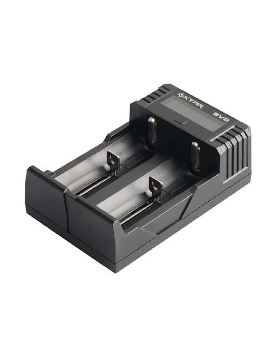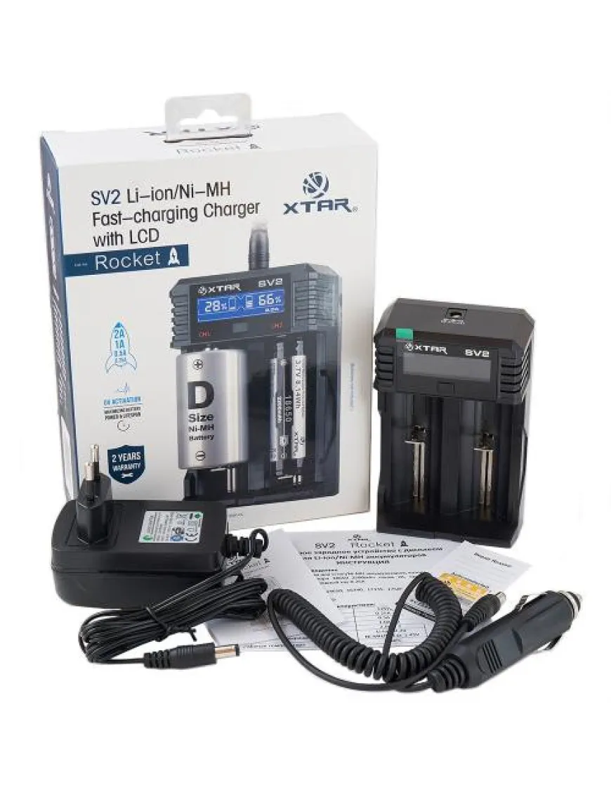 XTAR SV2 Rocket – це інтелектуальний зарядний пристрій для літій-іонних (Li-ion IMR, INR, ICR) та нікель-металогідридних/кадмієвих (Ni-MH, Ni-CD) акумуляторів, має два незалежні канали зарядки та рідкокристалічний дисплей. Наявність рухомого контакту дозволяє заряджати практично будь-які типорозміри акумуляторів. Інформативний LCD дисплей відображає в реальному часі струм заряду та рівень заряду акумуляторної батареї у відсотках. Ручне регулювання струму в 0.25, 0.5, 1, 2 Ампера дозволяє вибрати найбільш рекомендований та швидкісний струм заряду для ваших акумуляторів.