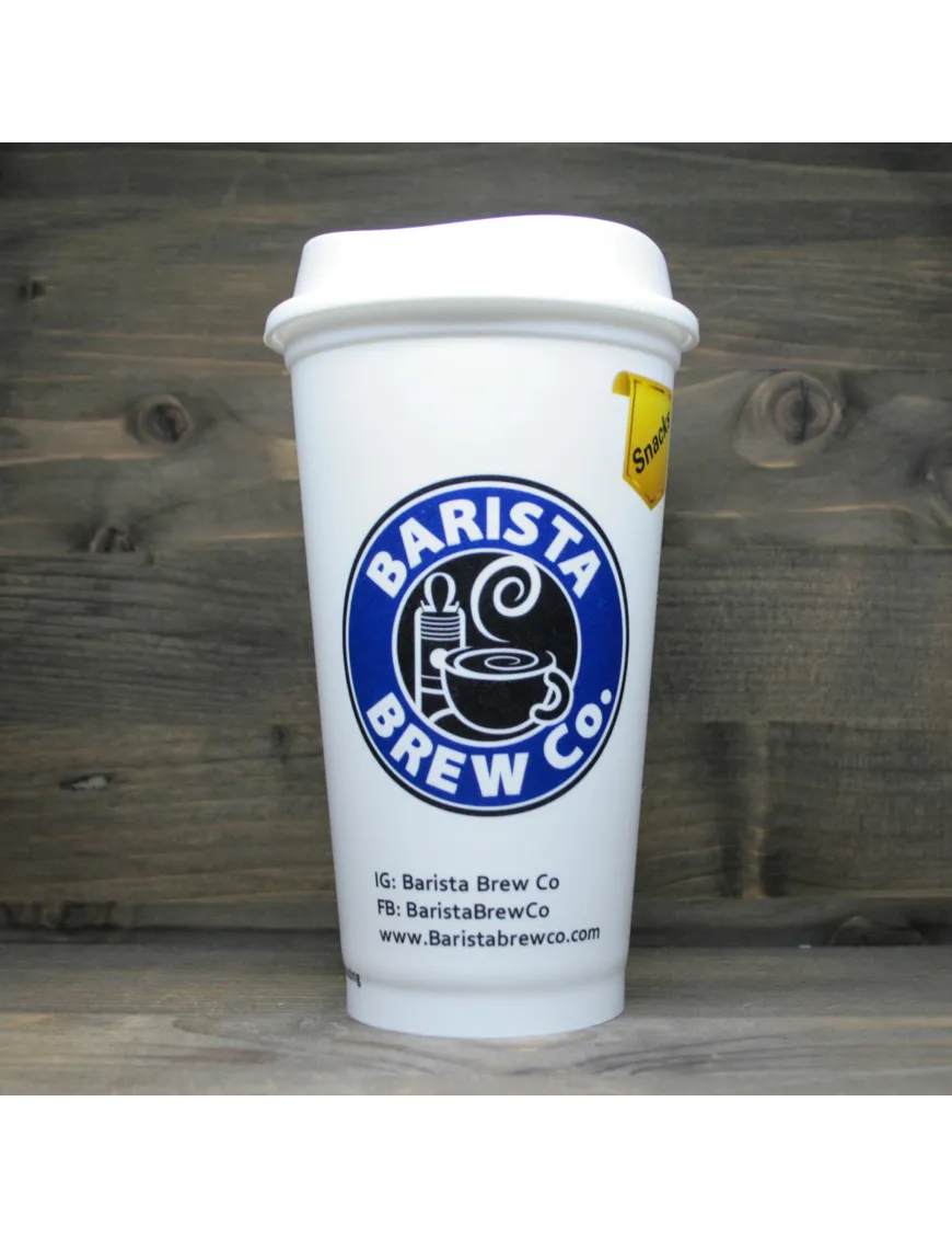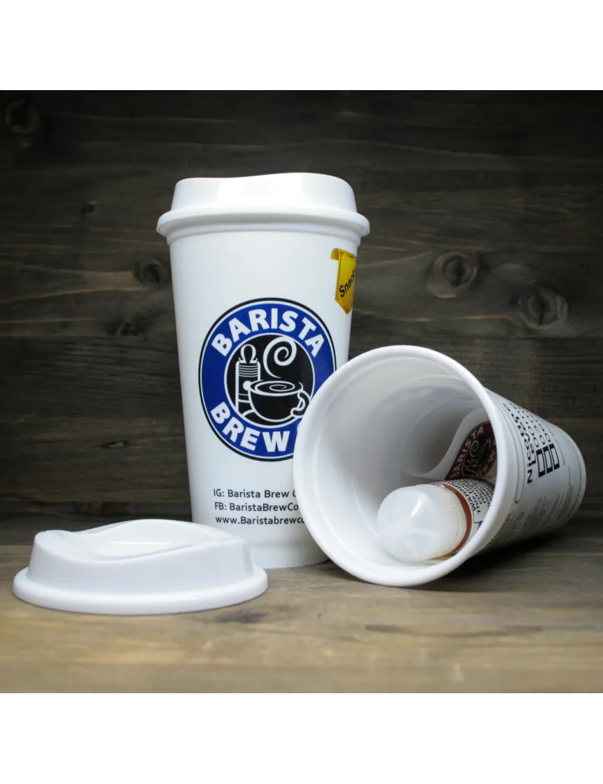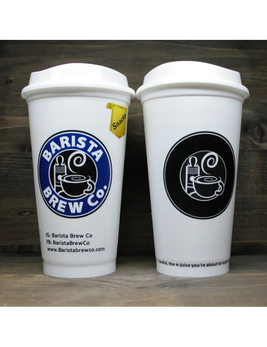 Рідина поставляється в унікальній упаковці – брендована склянка з кришкою. Дизайн склянки та колір кришки залежить від вибраного смаку. Всередині склянки рідина та гумовий чохол із нанесеним логотипом, для комфортного використання склянки з гарячими напоями.