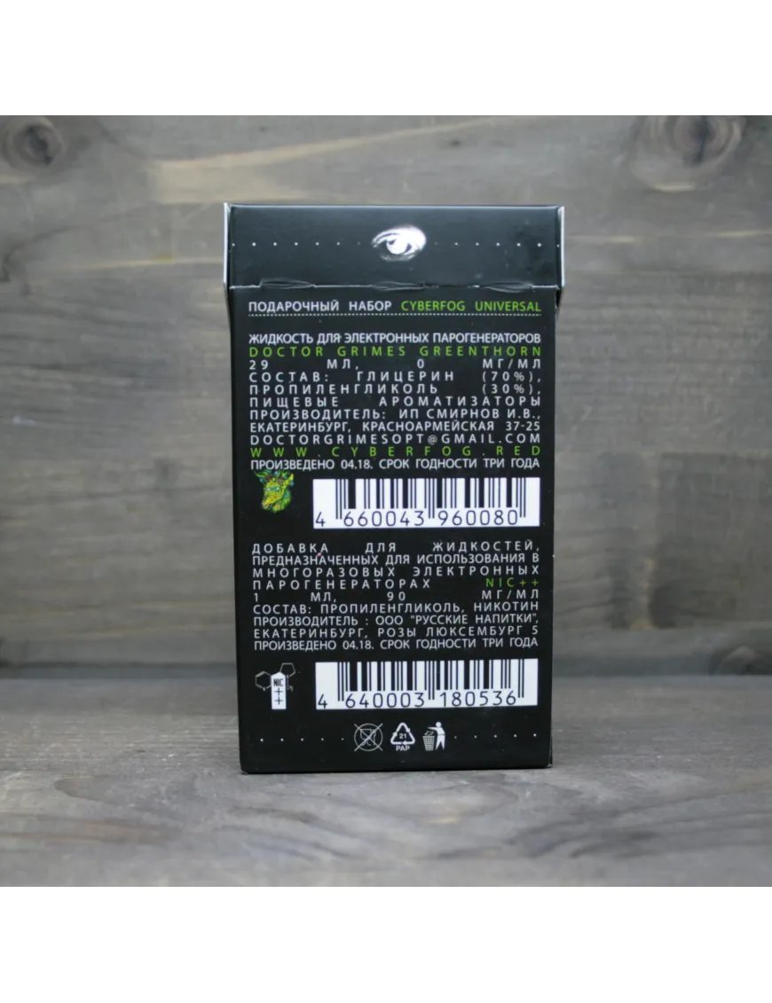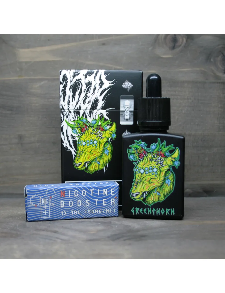 Інгредієнтами для рідини є пропілен гліколь 30%, гліцерин високого ступеня очищення 70% та харчові ароматизатори. У набір до рідини Greenthorn входить нікобустер із 1 мл нікотину. В результаті додавання нікотину у флакончик добре збовтайте і Ви отримаєте міцність 3мг/мл.