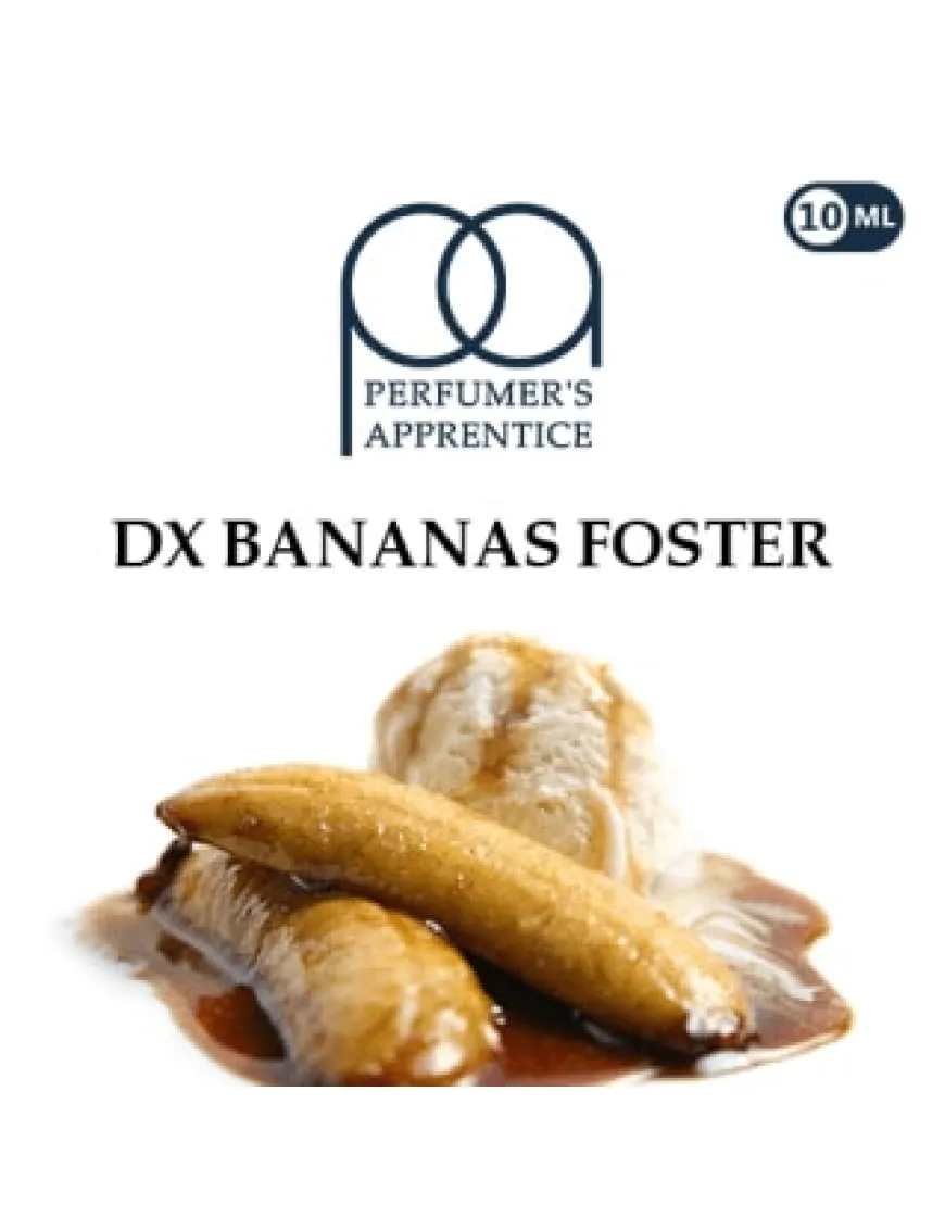 Банановий фостер – класичний американський десерт. TPA DX Bananas Foster – друга версія цього смаку від відомого бренду ароматизаторів! Десерт поєднує смаки бананів, ванільного морозива, кориці та мускатного горіха з нотками рому, карамелі та цукру демерара.