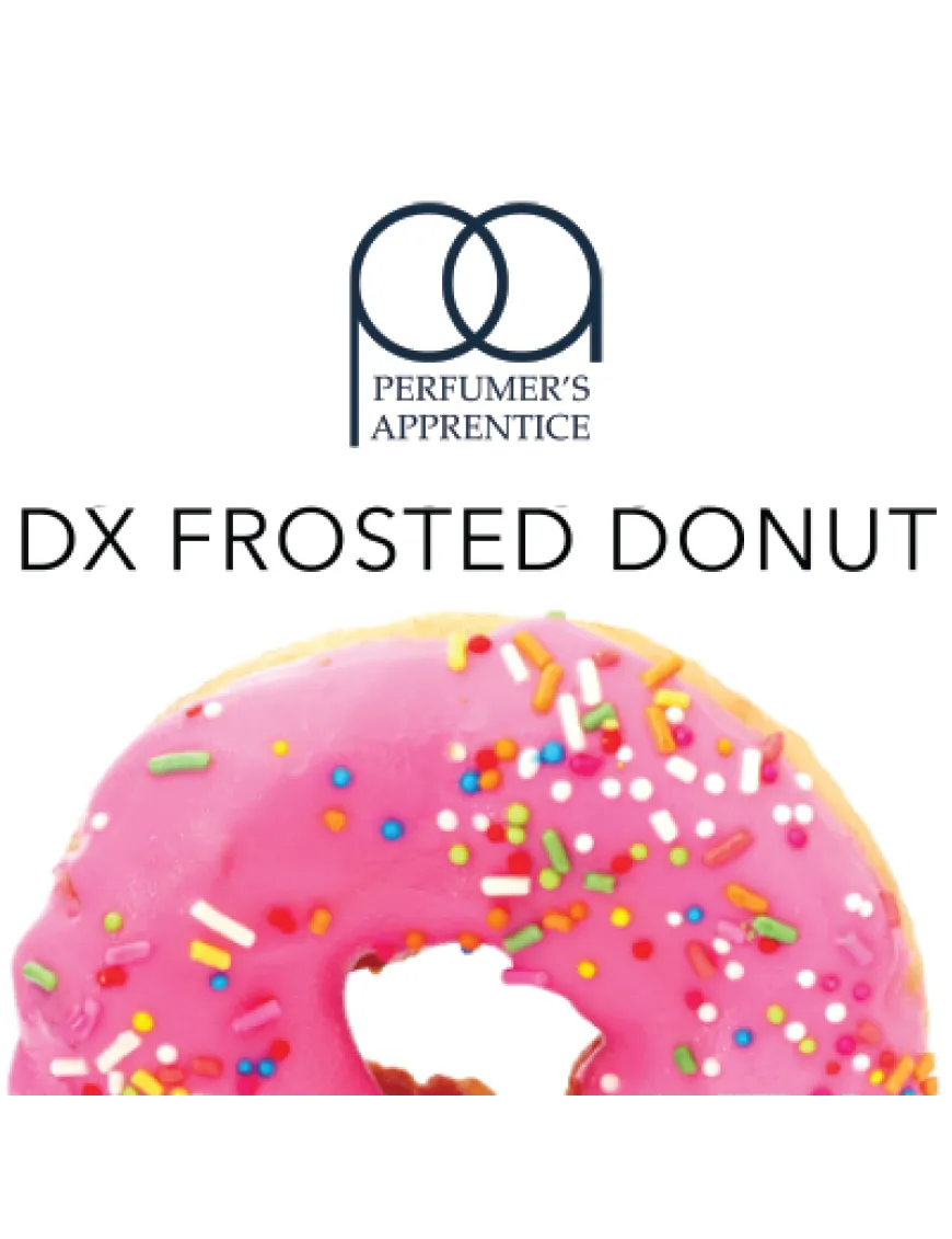 DX Frosted Donut – це аромат свіжого пончика із солодкою цукровою глазур'ю. Поєднайте його з вершками, смаками кремів, фруктами або ягодами, шоколадом, кавою. Пончик такий гарний у поєднанні з милкшейками та іншою випічкою! У другій версії ароматизатор не містить шкідливих речовин.
