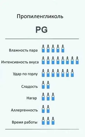 Якщо розглядати, що таке PG в рідині - то це компонент, що забезпечує швидке насичення і максимальну яскравість смаків. Але враховуйте, що пропіленгліколь дає сильний удар по горлу, що для деяких користувачів може бути некомфортно.