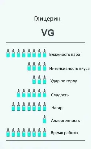 Натуральний гліцерин рослинного походження або VG - це цукровий спирт, що отримується з різних рослинних олій. Він менш затребуваний, ніж пропіленгліколь, але також відіграє важливу роль у властивостях рідини для паріння. Якщо говорити простими словами, що таке VG і для чого він потрібен, то це природний компонент, що забезпечує максимальну кількість пари. Він також відповідає за передачу смаку, густоту рідини і рівномірне змішування всіх інгредієнтів.