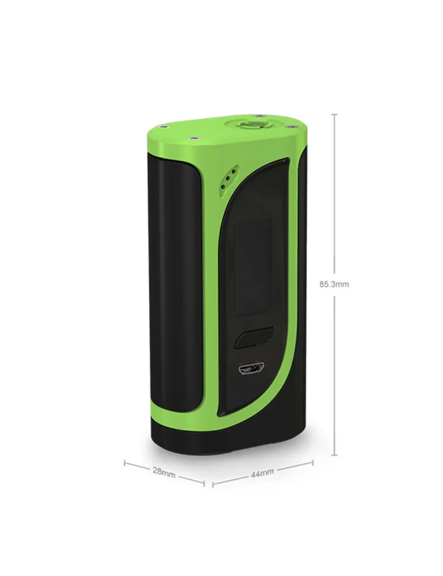 Внешний вид в целом типичный для устройств от Eleaf, но при этом он уникальный и симпатичный. Двухцветная концепция дает возможность выбрать устройство на свой вкус. На передней грани находится дисплей, объединённые кнопки плюс и минус, и порт USB. В виде кнопки Fire выступает вся боковая панель, что очень удобно. Коннекторная площадка которая расположена сверху готова принять атомайзеры диаметром до 28 миллиметров.