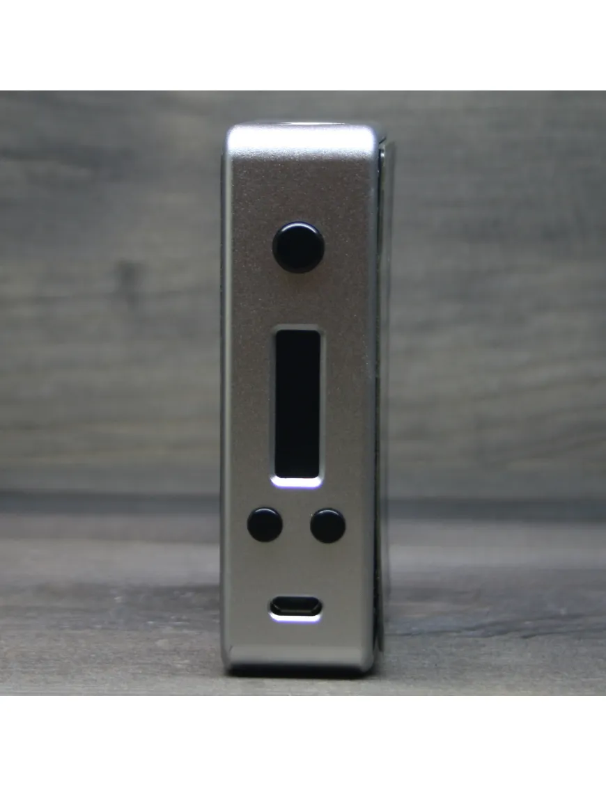 Сверху девайса находится стальной коннектор и подпружиненный латунный пин. Внизу находится 3 отверстия для охлаждения и отвода газов. На боковой панели сосредоточены все элементы управления девайсом: кнопка активации, регулировка мощности, информационный дисплей, а также разъем micro-USB для подзарядки устройства.
