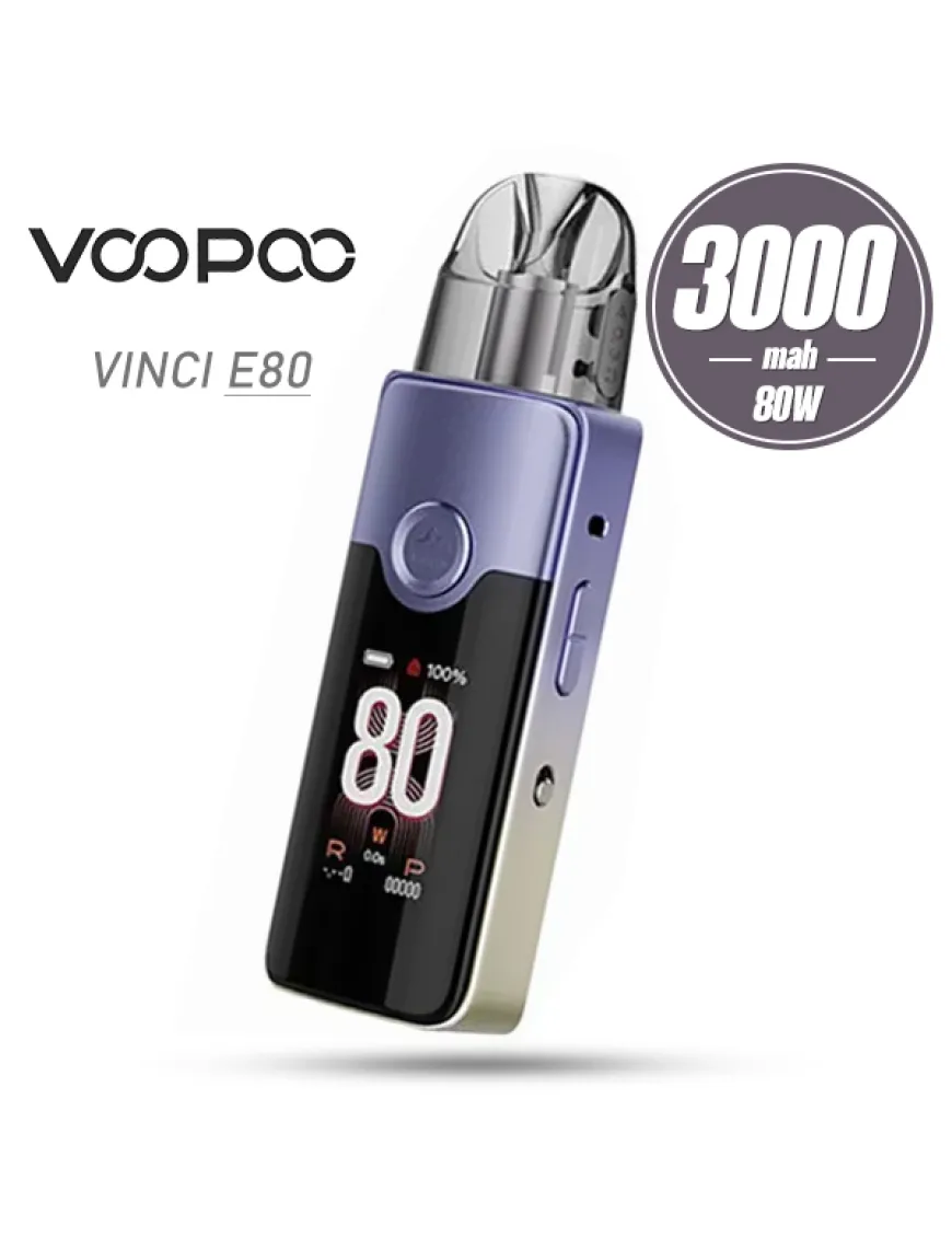 Voopoo Vinci E80 Pod Kit 3000 мАч - Pod система средних размеров, с большим дисплеем, мощным встроенным аккумулятором и укомплектованная новой картриджной системой на встроенных испарителях. Корпус устройства выполнен из алюминиевого сплава в виде приплюснутого стика с закругленными углами и гранями. Дисплей и кнопка активации расположены на лицевой стороне девайса, кнопки пользовательской настройки, ползунок блокировки устройства и современный разъем для зарядки размещены на одном из боковых торцов. На другом торце расположен аккуратный ползунок регулировки интенсивности затяжки. Питание Voopoo Vinci E80 обеспечивается встроенным аккумулятором, емкостью 3000 мАч, быстрая зарядка аккумулятора производится при помощи разъема USB Type-C, током 2А. Картриджная система новая - это резервуары на встроенных сеточных испарителях серии Vinci E, объемом 5 мл, с боковой, быстродоступной заправкой. Устройство так же поддерживает картриджи на сменных испарителях серии PnP X.