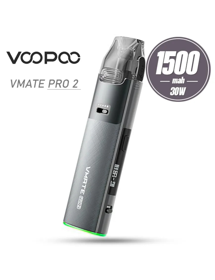 Voopoo VMATE Pro 2 Pod Kit 1500mAh - очередное пополнением линейки VMATE от компании Voopoo. Внешний вид навряд ли удивит поклонников бренда – тот же приплюснутый стик средних габаритов, корпус которого выполнен из цинкового сплава и украшен логотипом, узорами и разной обработкой этого самого металла, а также на нижнем торце вокруг порта зарядки появился обод с индикацией. На одной из боковых граней всё также расположен дисплей и кнопка управления, однако под дисплеем появился еще один элемент – рычажок переключения режимов парения – ECO и POWER. Экран по умолчанию отображает сопротивление, мощность, количество затяжек, заряд аккумулятора. При однократном нажатии кнопки управления меняется информация на экране. Рычажок переключения режимов работает приятно и сопровождается индикацией расположенной по кругу у основания девайса. В режиме POWER пользователь самостоятельно выставляет мощность работы девайса, а в режиме ECO, по заявлению производителя, устройство интеллектуально распознает привычки пользователей в парении и динамически регулирует мощность. Это гарантирует отсутствие компромиссов по вкусу, при этом действительно достигая энергоэффективности – экономя батарею, так и жидкость, эффективно сокращая расходы. Питание Voopoo VMATE Pro 2 обеспечивается встроенным аккумулятором, емкостью 1500 мАч, зарядка аккумулятора производится при помощи разъема USB Type-C, расположенного на нижнем торце устройства, током 2А. На лицевой стороне расположен аккуратный ползунок регулировки тугости затяжки. Ползунок двигается плавно, но с небольшим усилием. Активация устройства достигается исключительно по затяжке. Картриджная система уже знакома – это расходники на встроенных испарителях VMATE Top Fill Cartridge с быстрой боковой заправкой, хорошей вместительностью, продолжительным сроком службы, а также усовершенствованной системой защиты от протечек. Устройство комплектуется двумя картриджами со встроенными испарителями на сетке, сопротивлением 0.4 и 0.7 Ом.