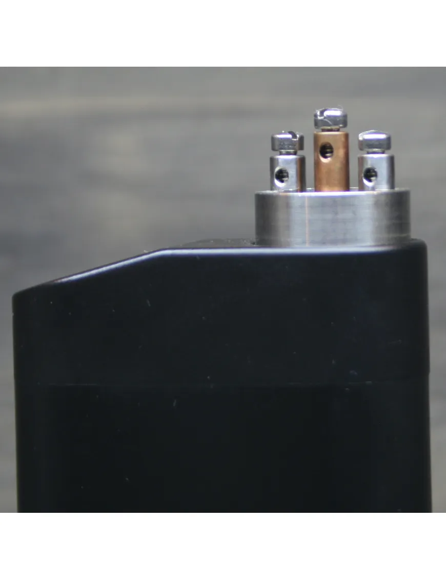 Один отсек для батареи расположен в нижней части корпуса, здесь же находятся круглые отверстия для отвода газов. В верхней части предусмотрена кнопка и отверстие второго аккумулятора. Начинать установку нужно с нижнего, закручивать крышку, пока батарея не станет на место плотно. После того, как будет установлен верхний аккумулятор, навинчивается дрипка.