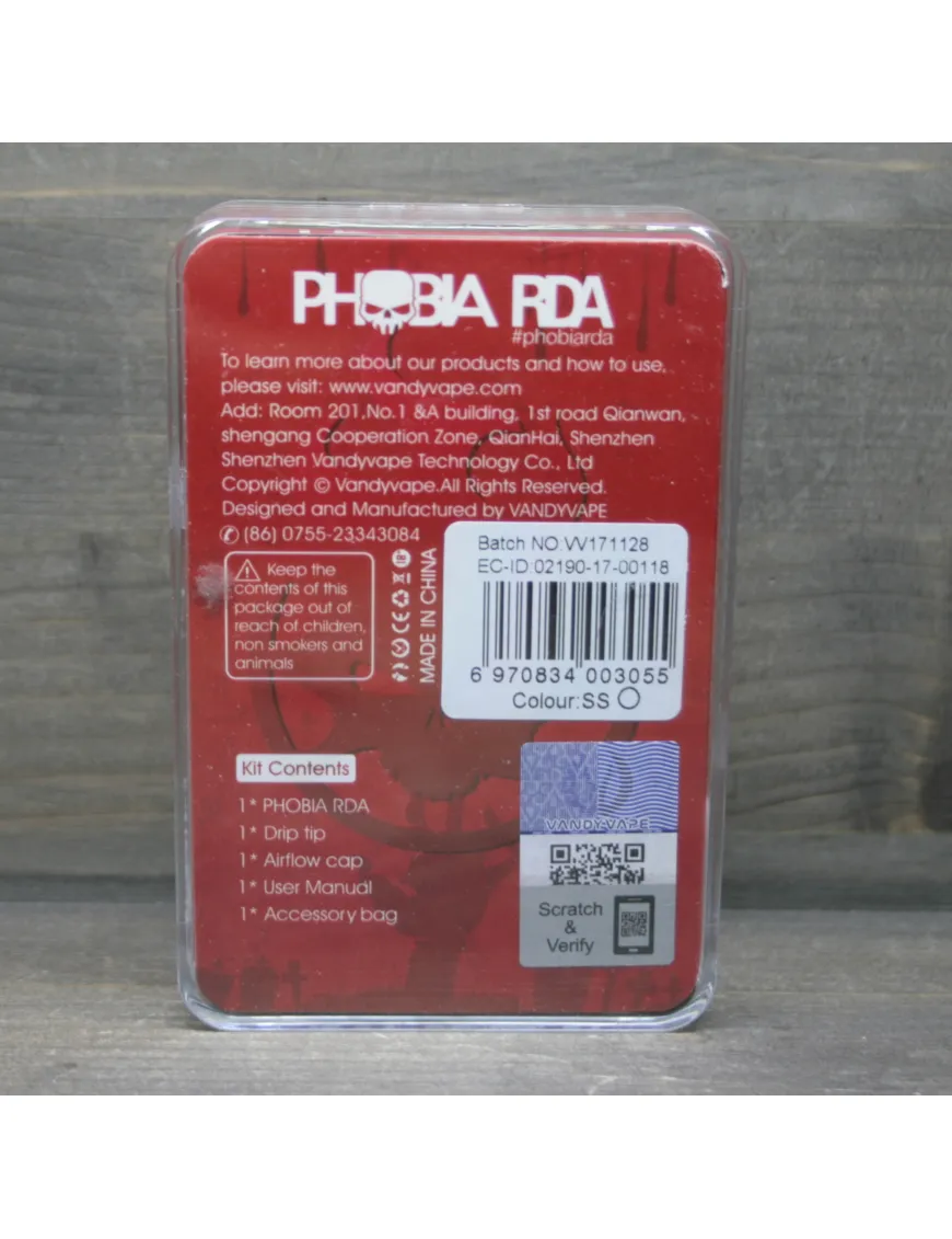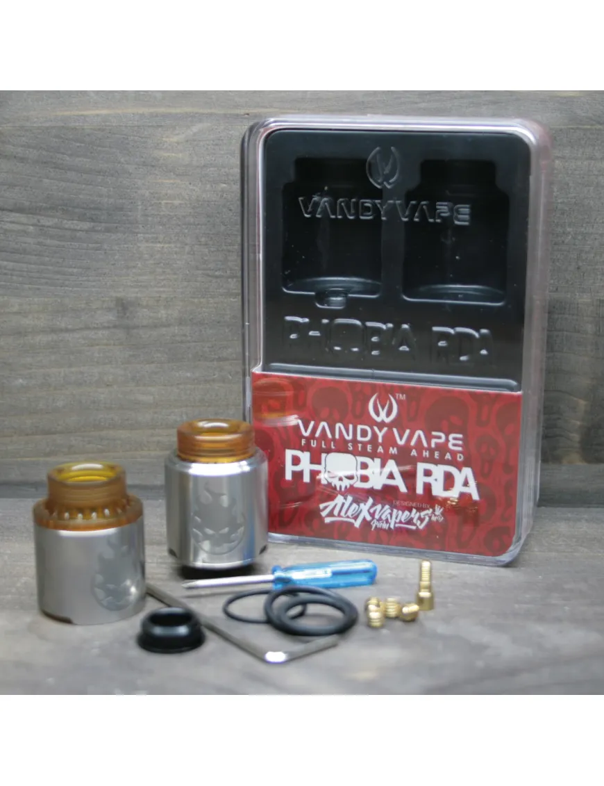 Компания Vandy Vape совместно с обзорщиком Alex from VapersMD выпустили новое устройство под названием Phobia RDA. Представлена в популярных цветах. Очень лаконичный дизайн. Корпус выполнен из нержавеющей стали. Купол со сферической обработкой. На юбке присутствует гравировка в виде огненного черепа.