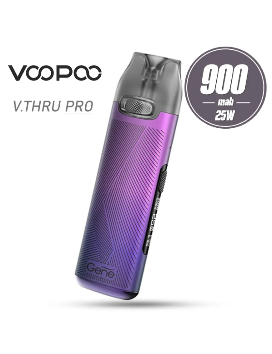 Voopoo V.THRU Pro Pod Kit - компактный под мод, оснащенный аккумулятором средней емкости, который работает под управлением чипсета Gene и рассчитан на использование сменных картриджей со встроенным испарителем. Выглядит Voopoo V.THRU Pro Pod довольно стандартно - небольшой «обмылок» с размерами 95.5 х 28.5 х 14.9 мм, а вес за счет использования алюминиевого сплава и пластика всего 44 грамма, поэтому в кармане он займет места не больше, чем зажигалка. Устройство работает на мощности 5 - 25 Ватт, что обеспечивается встроенным аккумулятором емкостью 900 мАч - его вполне хватит на день-полтора автономной работы. Заряжается аккумулятор с помощью разъема USB Type-C, расположенного на нижнем торце током 1 А. Важная особенность девайса - это чип Gene, который адаптирован под его мощность и задачи, сводящиеся к простому варивату. Pod система оснащена маленьким монохромным дисплеем, отображающим минимум информации и единственной кнопкой, с помощью которой по кругу можно выставить рабочую мощность. Активация устройства происходит при затяжке, поэтому пользоваться девайсом очень просто - разберется даже новичок. В Voopoo V.THRU Pro Pod разработчики решили не использовать сменные испарители, ограничившись сменными картриджами двух видов. В батарейном блоке картриджи удерживаются с помощью привычных магнитов. Интересно то, что инженеры Voopoo внедрили в картриджах инновационную конструкцию, предотвращающую образование конденсата между картриджем и батарейным блоком. Производитель предлагает два типа картриджей V.THRU Pro Cartridge - 0,7 и 1,2 Ом, причем первый вариант на сетке, а второй на стандартной спирали, регулировка обдува не предусмотрена.