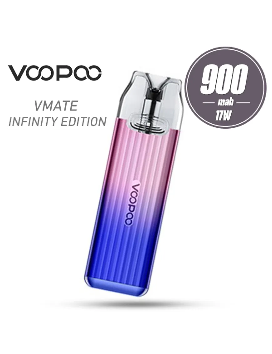 VooPoo VMATE Infinity Edition 900 мАч - Компактная POD система, оснащенная емким аккумулятором, рассчитанная на установку сменных картриджей серий VMATE и V.THRU. Основное отличие Voopoo VMATE Infinity Edition POD kit от предыдущей версии – это оформление девайса, так как форм-фактор корпуса решили не менять. Внешний вид устройства стал немного агрессивнее и более привлекательным – появились вертикальные полосы и оригинальные цвета. Размеры POD системы достаточно скромные – 95.5 х 28.5 х 15 мм, причем вес, за счет использования при производстве алюминиевого сплава, небольшой. Питание VMATE Infinity Edition обеспечивается встроенным аккумулятором емкостью 900 мАч, который заряжается через разъем USB Type-C, током 1А. Устройство работает под управлением чипсета GENE.AI, благодаря которому выходная мощность составляет около 17 Ватт. Активация девайса производится только при затяжке (никаких элементов управления нет). Для того чтобы контролировать уровень зарядки АКБ, на боковой грани имеется светодиодный индикатор, выполненный в виде знака бесконечности. Pod система комплектуется представленным ранее картриджем Voopoo VMATE V2 со встроенным испарителем на сетке, сопротивлением 0.7 Ом. Картриджи этой серии полностью совместимы с устройствами серий VMATE и V.Thru. Испарители внутри картриджей изготовлены по технологии ITO, призванной улучшить вкусопередачу путем более ровного распределния тепла по сетке. Настройки интенсивности затяжек, увы, по-прежнему нет, а обдувы расположены по бокам. Для того чтобы заправить картридж, его необходимо вынуть из батарейного блока, открыть на боковой поверхности силиконовую заглушку и залить 3 мл жидкости.